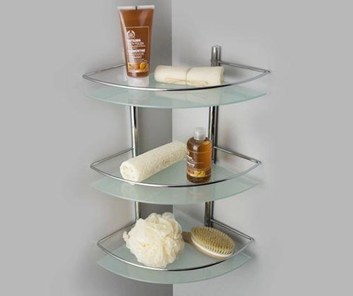 K-3133 Полка стеклянная угловая тройная 31 см 31/61/31 Металл, хромоникелевое покрытие, уплотнительные пластиковые кольца, закаленное матовое стекло