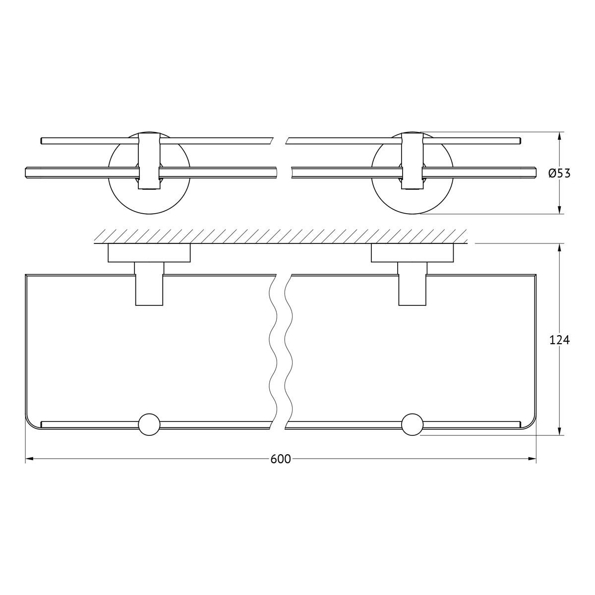 Полка с держателями 60 cm торговой марки ARTWELLE коллекции Harmonie, артикул: HAR 036 имеет размер в мм: Ширина - 600, Высота - 53, Длина - 124, Вес нетто в граммах: 1695, Расположение: Настенное, Крепление: Саморез, Материал: Латунь; Стекло.