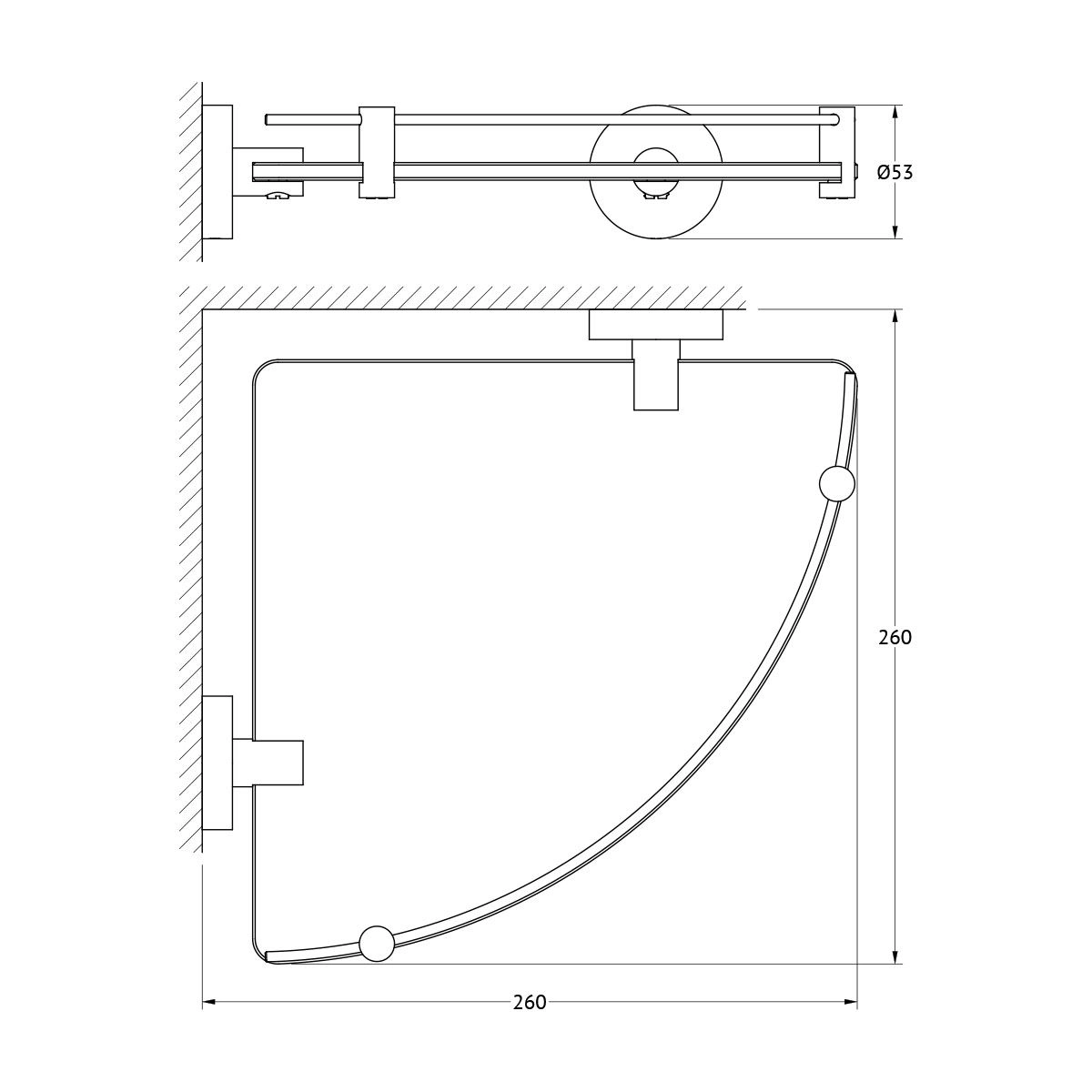 Полка угловая с держателями 26 cm торговой марки ARTWELLE коллекции Harmonie, артикул: HAR 039 имеет размер в мм: Ширина - 260, Высота - 53, Длина - 260, Вес нетто в граммах: 1392, Расположение: Настенное, Крепление: Саморез, Материал: Латунь; Стекло.