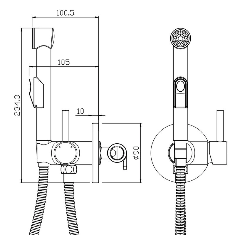 Смеситель комплектуется душевыми аксессуарами: 1-режимная гигиеническая лейка, душевой шланг с защитой от перекручивания.