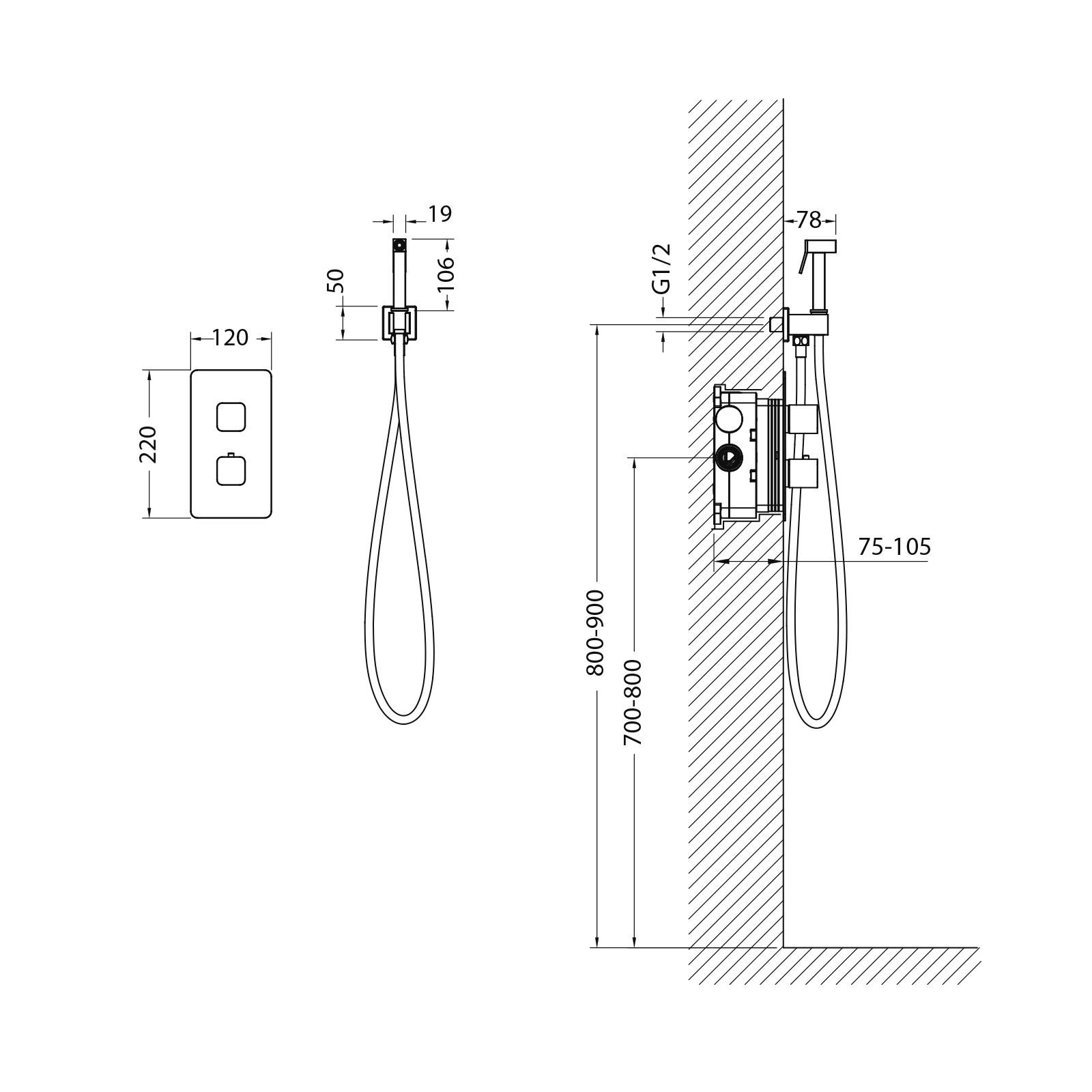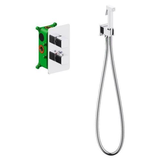 Встраиваемый смеситель с гигиеническим душем и термостатом Timo Petruma 5089 предназначен для монтажа в твердой или полой стене. Основные преимущества встроенного смесителя: элегантный внешний вид, все коммуникации и крепления спрятаны в стену, снаружи видны только декоративные элементы. Установить встроенный смеситель можно в любом месте. Регулировка температуры воды осуществляется ручкой термостата (расположена снизу), термостатический картридж поддерживает стабильную температуру воды. Управление смесителем осуществляется поворотом ручки (расположена сверху) влево. В положнии верхней ручки 12:00 смеситель выключен. Длины шланга 1,2 метра хватает для решения гигиенических задач. Можно также использовать например, для мытья собаки после прогулки или наполнения ведра воды и т.д. Смеситель отлично сочетается с инсталляцией для унитаза. Сложностей монтажа не возникает при установке смесителя опытным сантехником. Внимательно изучите инструкцию по монтажу и эксплуатации.
