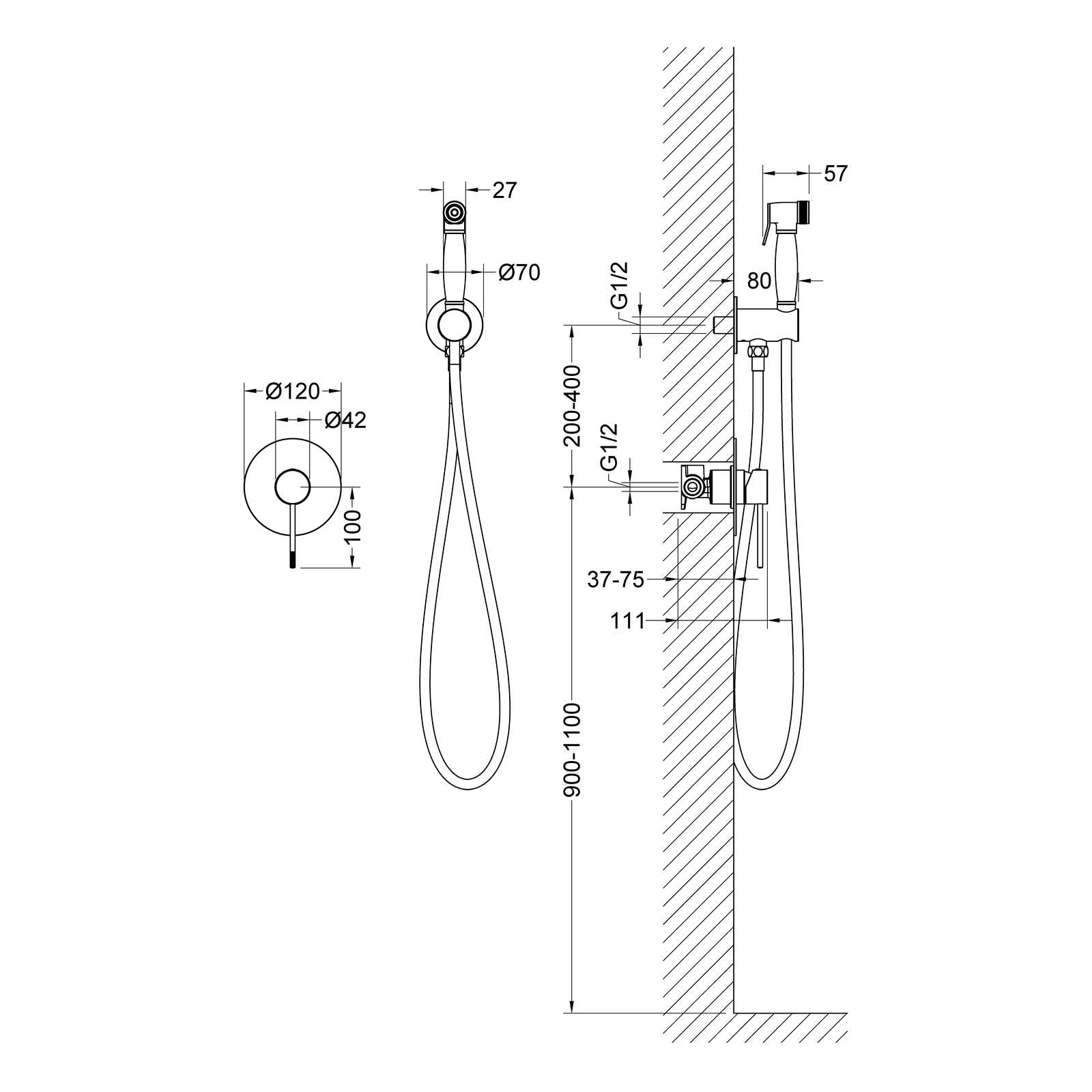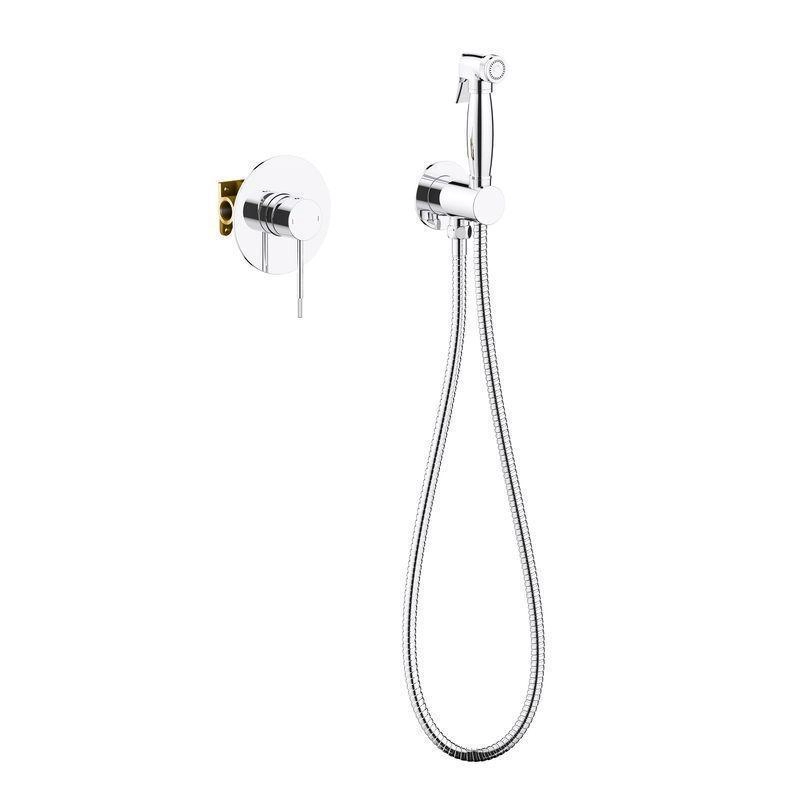 Комплектация : Смеситель скрытого монтажа- 1 шт. Декоративная накладка смесителя (латунная) - 1 шт. Ручка управления смесителем - 1 шт. Шланг душа 1,2 м - 1 шт. Отвод из стены - держатель лейки (латунный) - 1 шт. Гигиеническая лейка (пластик) - 1 шт. Инструкция - 1 шт.Материал корпуса латунь