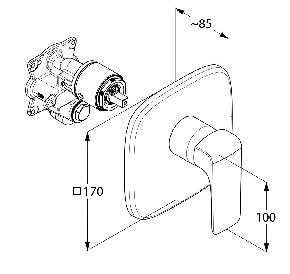 Основные характеристики: - Смеситель для ванны и душа - Внешняя монтажная часть - Способ монтажа: встраиваемый - Излив: нет - Количество монтажных отверстий: 1 - Керамический картридж - Ограничение температуры воды - Форма: квадратная - Материал: латунь - Цвет: хром