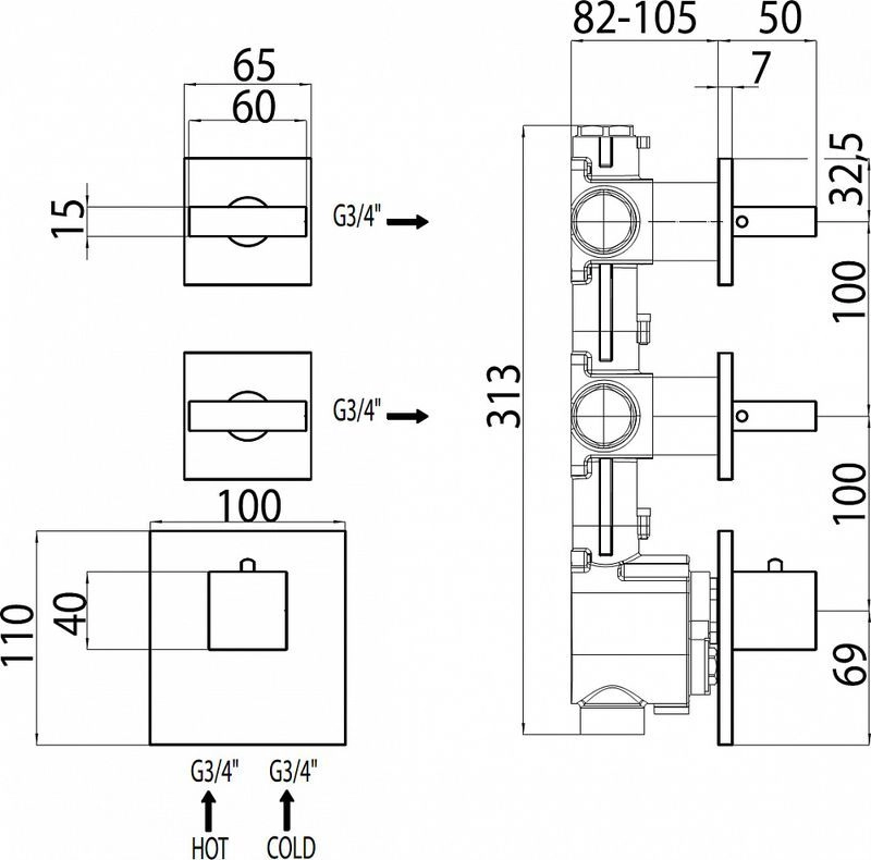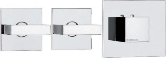 Наружная часть термостата Bossini HighFlow цвет: хром тип смесителя: двухзахватный количество потребителей: 2 материал: латунь тип переключателя: термостатический картридж форма: прямоугольная отверстие для монтажа: три отверстия тип подводки: жёсткая стандарт подводки: 3/4" материал картриджа: керамика подходит для Z030201000, Z030203000, Z030270000