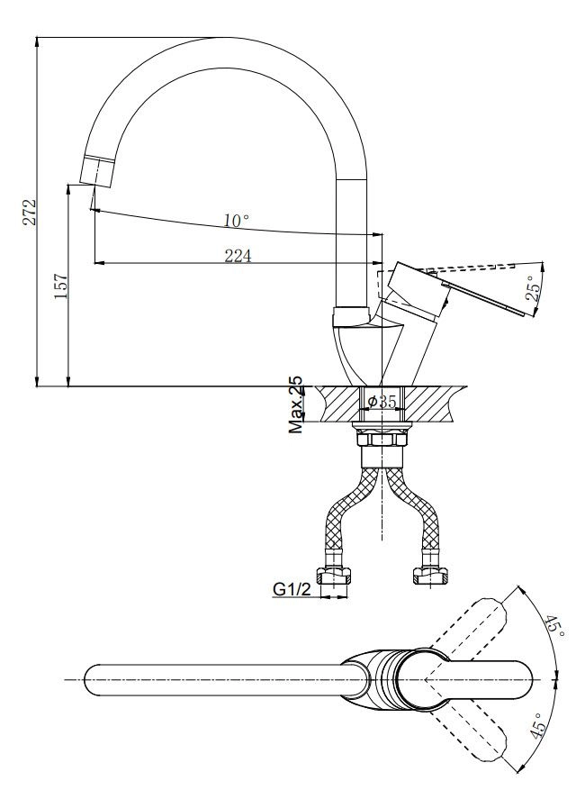 • Картридж с керамическими пластинами D-35 • Пластиковый аэратор с нержавеющим корпусом • Универсальная присоединительная группа для установки на горизонтальную поверхность • Гибкая подводка с латунными гайками 40 см -2шт. • Металлическая ручка