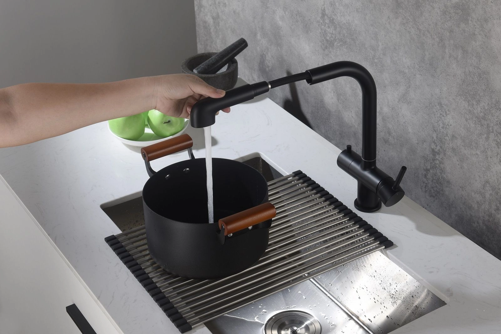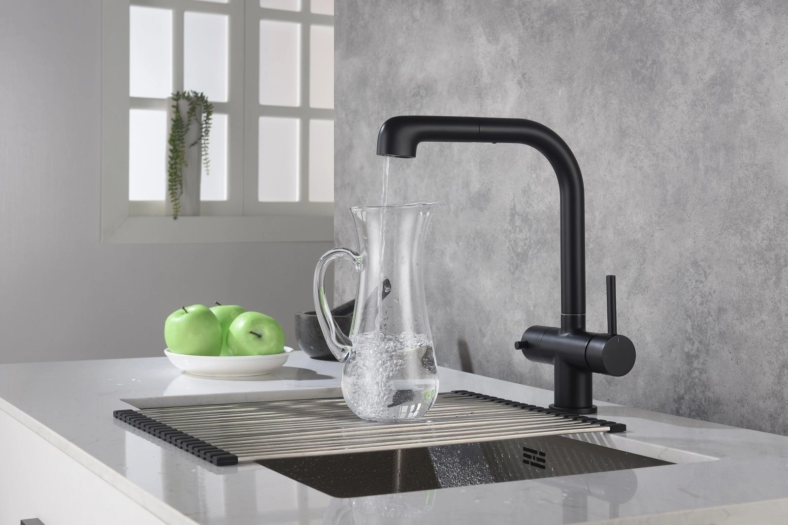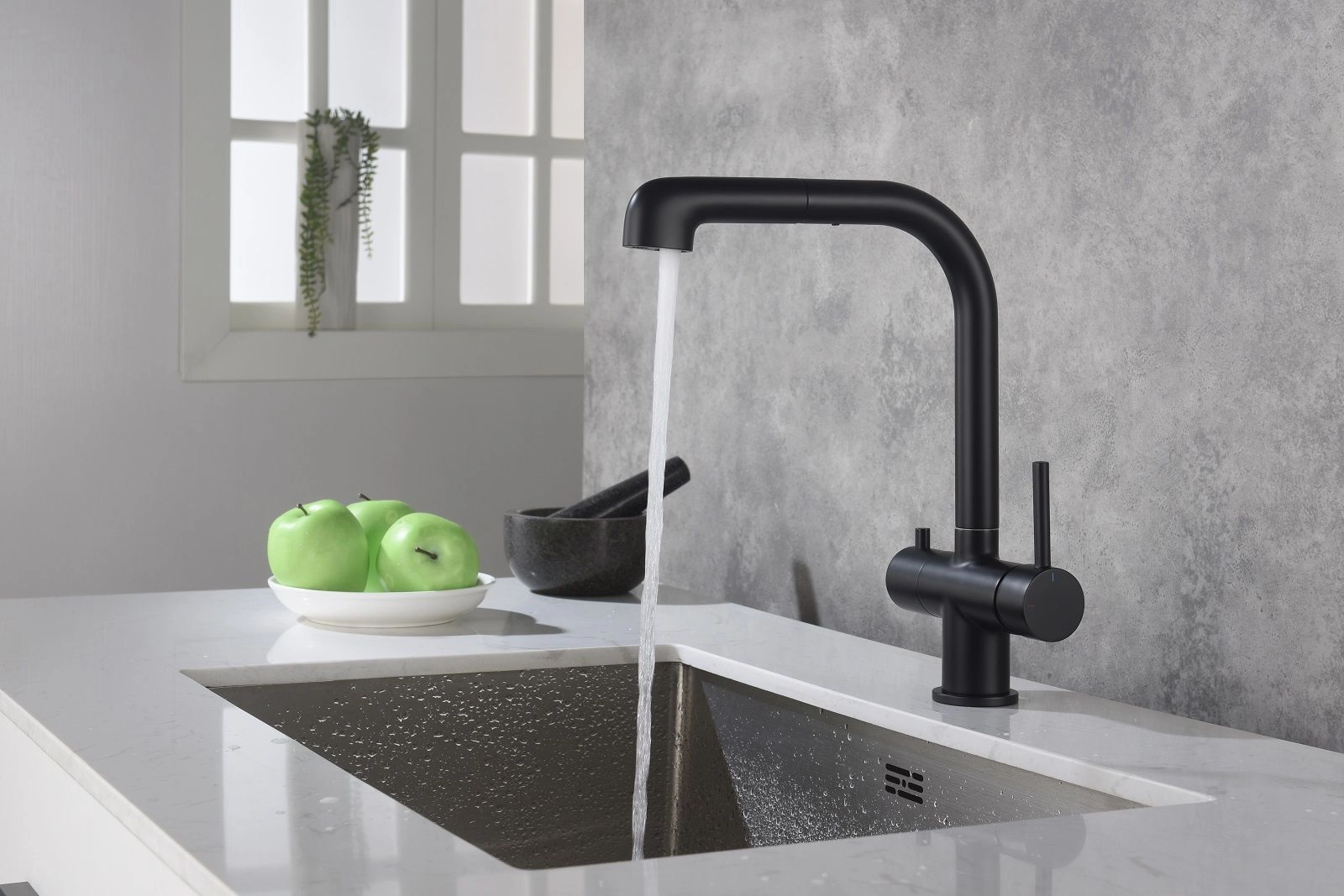 Черная сантехника становится все более популярной из-за способности расставлять акценты. Смеситель Timo Saona 2346 с выдвижной лейкой и системой подключения фильтрованной воды относится к премиальному сегменту, предназначен для монтажа на кухонную мойку или столешницу. Высокий излив подходит для моек с двумя чашами, а также позволяет справляться с мытьем габаритной посуды. Удобное (вертикальное) расположение рычага смесителя в крайнем положении "холодный старт", позволяет не задевать ручкой за стеновые панели, фартук, предметы, которые находятся за смесителем. Картридж с функцией "холодный старт" работает в диапозоне 90 градусов, рычаг установленный в исходное положение (вертикально) при открытии подает только холодную воду, а не 50% холодной воды плюс 50% горячей, позволяя экономить до 30% расход горячей воды. Для подачи горячей воды необходимо повернуть рычаг на себя. Выдвижная лейка с прочным шлангом длинной 400мм облегчает мытье раковины, крупной посуды, позволяет набрать воду в емкость, стоящую рядом с мойкой. Встроенный магнитный держать позволяет легко вернуть лейку в исходное положение. В нижней части смесителя установлена трубка с адаптером для соединения с трубкой фильтра. Подача фильтрованной воды осуществляется поворотом ручки дивертора расположенной слева на корпусе смесителя. Сложностей монтажа не возникает при установке смесителя опытным сантехником. Внимательно изучите инструкцию по монтажу и эксплуатации.