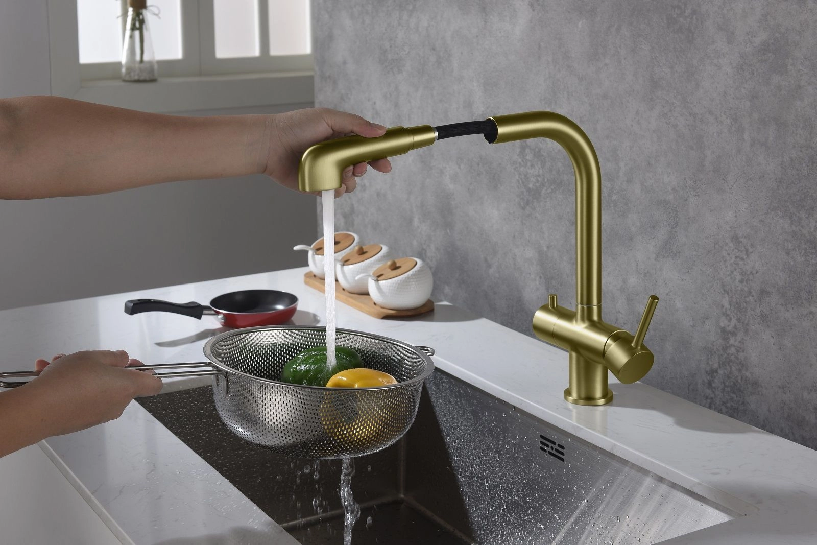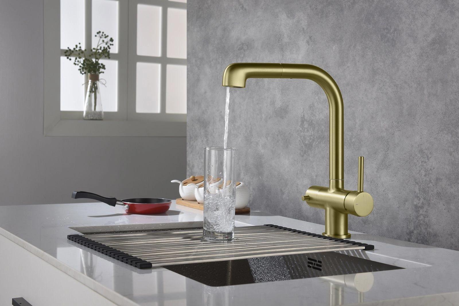 Цвет "матовое золото" никогда не выйдет из моды, во все времена драгоценный металл был признаком богатства. Смеситель Timo Saona 2346 с выдвижной лейкой и системой подключения фильтрованной воды относится к премиальному сегменту, предназначен для монтажа на кухонную мойку или столешницу. Высокий излив подходит для моек с двумя чашами, а также позволяет справляться с мытьем габаритной посуды. Удобное (вертикальное) расположение рычага смесителя в крайнем положении "холодный старт", позволяет не задевать ручкой за стеновые панели, фартук, предметы, которые находятся за смесителем. Картридж с функцией "холодный старт" работает в диапозоне 90 градусов, рычаг установленный в исходное положение (вертикально) при открытии подает только холодную воду, а не 50% холодной воды плюс 50% горячей, позволяя экономить до 30% расход горячей воды. Для подачи горячей воды необходимо повернуть рычаг на себя. Выдвижная лейка с прочным шлангом длинной 400мм облегчает мытье раковины, крупной посуды, позволяет набрать воду в емкость, стоящую рядом с мойкой. Встроенный магнитный держать позволяет легко вернуть лейку в исходное положение. В нижней части смесителя установлена трубка с адаптером для соединения с трубкой фильтра. Подача фильтрованной воды осуществляется поворотом ручки дивертора расположенной слева на корпусе смесителя. Сложностей монтажа не возникает при установке смесителя опытным сантехником. Внимательно изучите инструкцию по монтажу и эксплуатации.