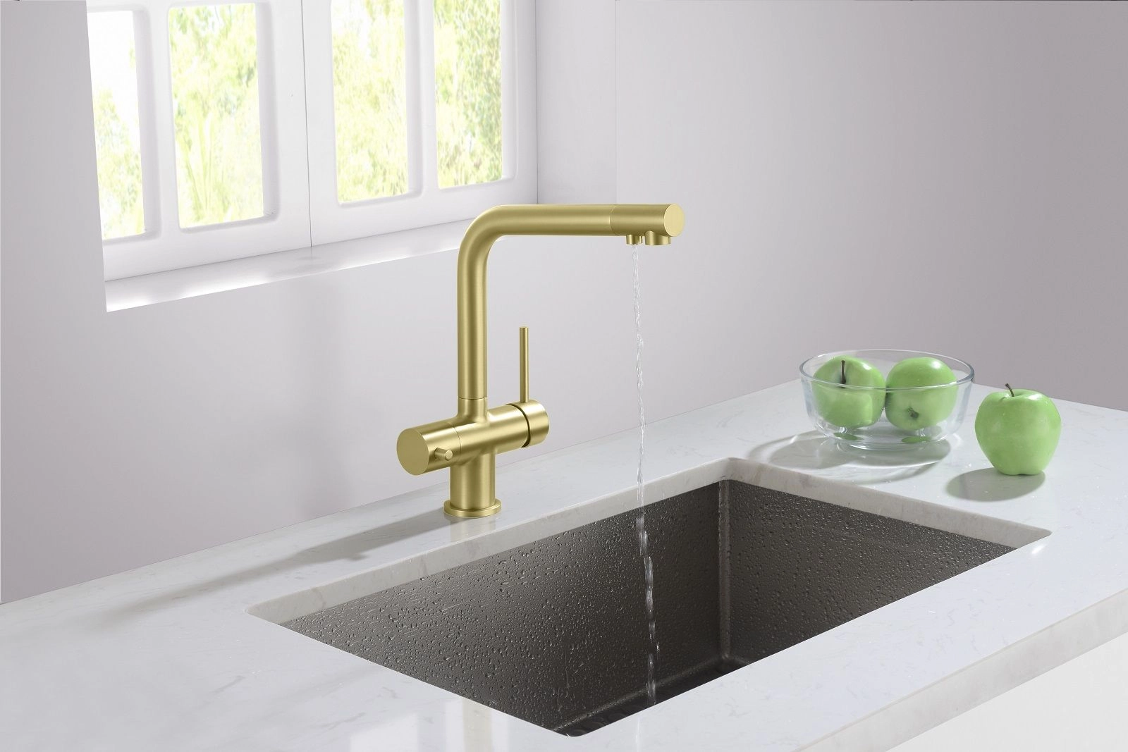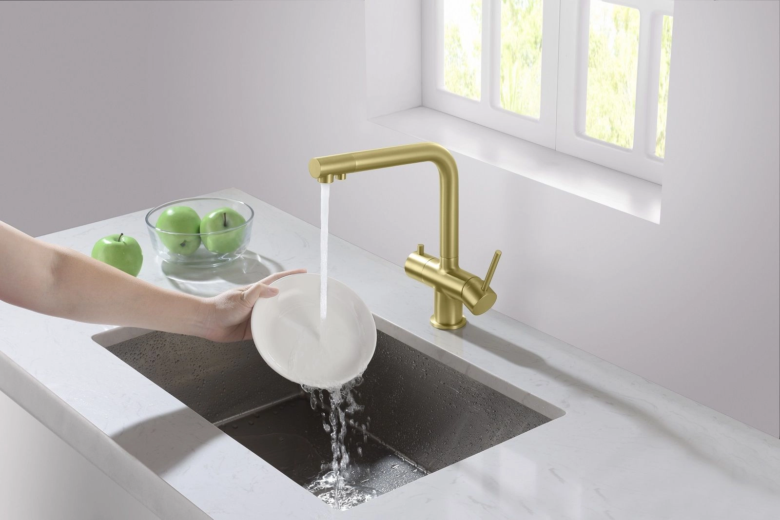 Цвет "матовое золото" никогда не выйдет из моды, во все времена драгоценный металл был признаком богатства. Смеситель Timo Saona 2396 с системой подключения фильтрованной воды относится к премиальному сегменту, предназначен для монтажа на кухонную мойку или столешницу. Высокий излив подходит для моек с двумя чашами, а также позволяет справляться с мытьем габаритной посуды. Удобное (вертикальное) расположение рычага смесителя в крайнем положении "холодный старт", позволяет не задевать ручкой за стеновые панели, фартук, предметы, которые находятся за смесителем. Картридж с функцией "холодный старт" работает в диапозоне 90 градусов, рычаг установленный в исходное положение (вертикально) при открытии подает только холодную воду, а не 50% холодной воды плюс 50% горячей, позволяя экономить до 30% расход горячей воды. В нижней части смесителя установлены 2 трубки с адаптером (можно подключиться к любой из них) для соединения с трубкой фильтра. Подача фильтрованной воды осуществляется поворотом ручки дивертора, расположенной слева на корпусе смесителя (от себя или на себя) в зависимости от того какую из трубок вы выбрали для подключения с трубкой фильтра. Вставьте заглушку (входит в комплект) до упора в свободную трубку. Положение 12-00 дивертор выключен. Сложностей монтажа не возникает при установке смесителя опытным сантехником. Внимательно изучите инструкцию по монтажу и эксплуатации.