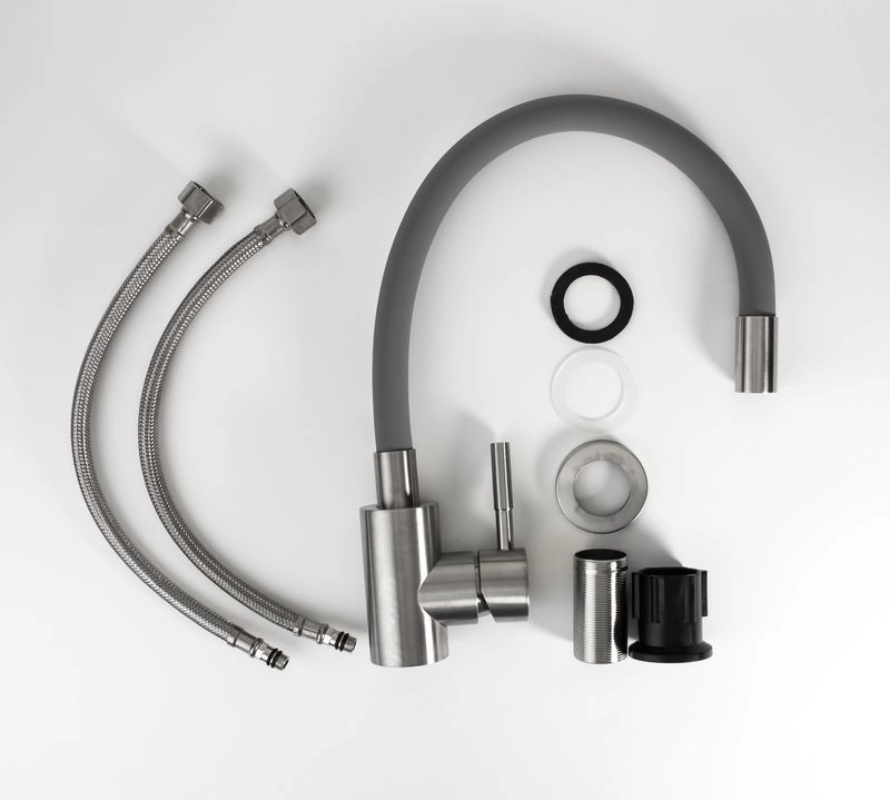 Корпус: нержавеющая сталь, марка SUS 304 пищевая сталь Излив: гибкий, трехслойный, EPDM резина. Картридж: универсальный ESKO, 35мм Комплектация: пьедесталметалл, ребро жесткости, крепление FastFix,гибкая подводка 35см.