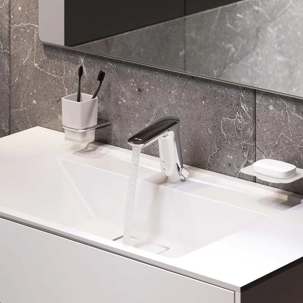 Идеальная геометрия, разработанная по стандарту SA (Smart Angle) – математические выверенное соотношение высоты смесителя, длины излива и наклона корпуса для удобного использования на умывальнике любого размера;