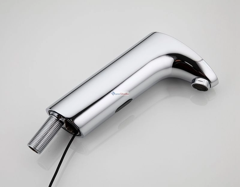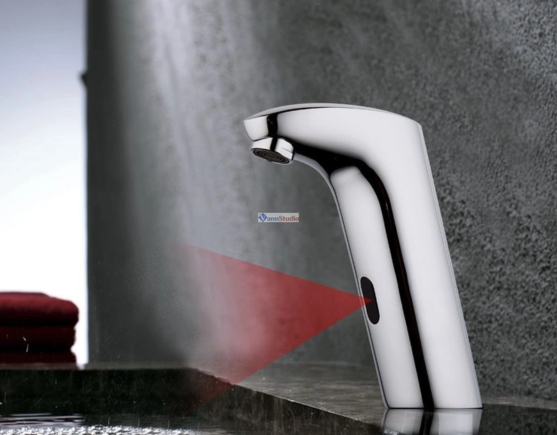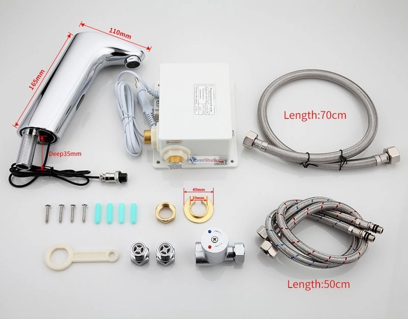 Бесконтактный смеситель для умывальника с терморегулятором. Включение и выключение воды осуществляется автоматически при поднесении рук. Высота смесителя 170 мм. Питание от сети с возможностью резервного питания от батареек.
