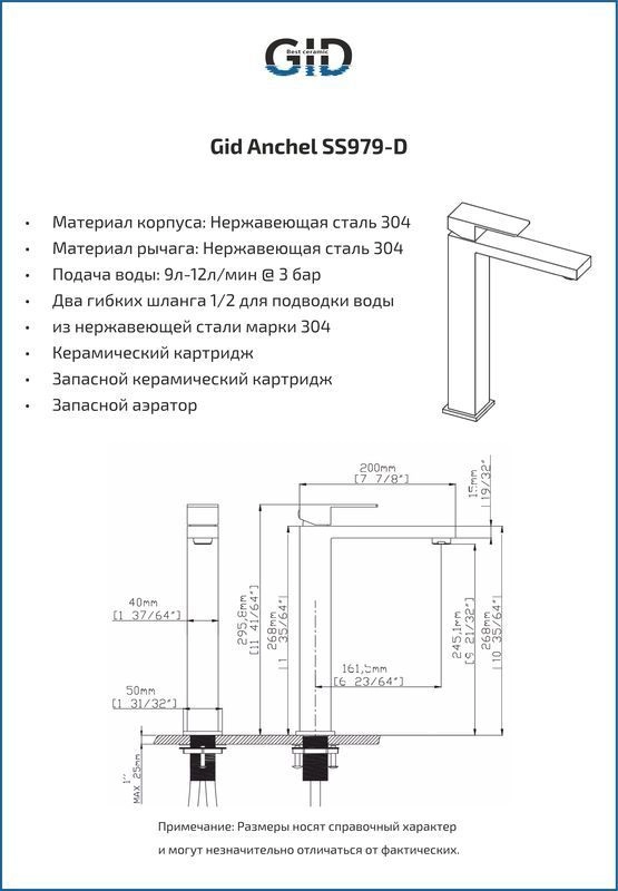 Корпус смесителя Gid выполнен из высококачественной санитарной латуни. Запасной картридж.Без донного клапана.