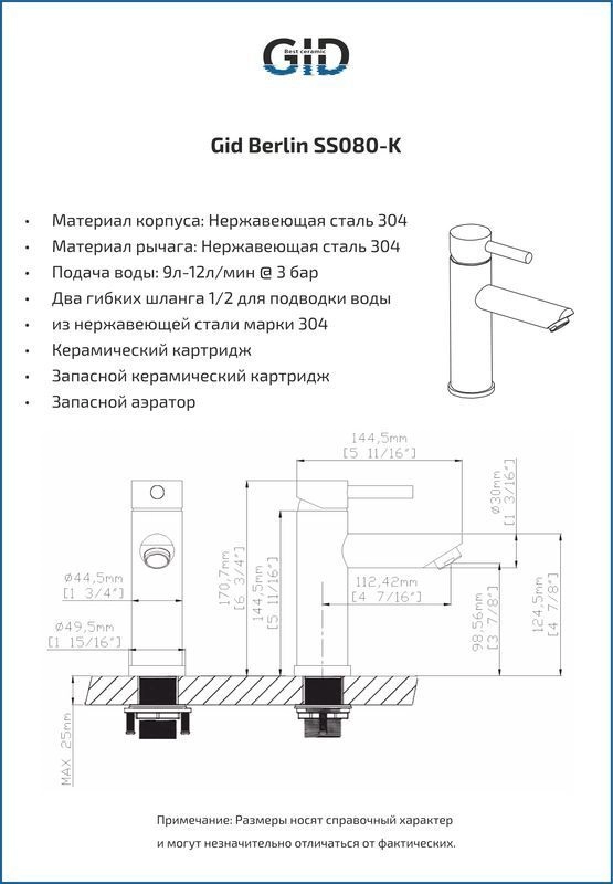 Корпус смесителя Gid выполнен из высококачественной санитарной латуни. Запасной картридж.Без донного клапана.