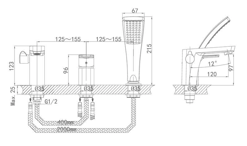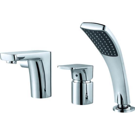 Смеситель D&K DA1434901 на борт ванны врезной на 3 отверстия хром каскадный, керамический картридж, керамический дивертер, крепеж, шланг 2 м., лейка. Подводка воды в комплект не входит.