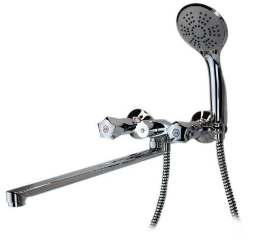 Корпус: латунь кат.A Ручки: металл, с защитой от нагревания Излив: поворотный, 350cм Кран-буксы: универсальные ESKO, ход 180 градусов Переключатель: механическийкерамика Комплектация: эксцентрики, отражатели, шланг душевой металл - 150см., лейка душевая1 режим, держатель - латунное кольцо на теле смесителя.
