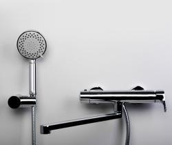 Смеситель Berkel 4802L для ванны с длинным изливом, хром Керамический картридж 35мм, Sedal (Испания), Встроенный пластиковый аэратор Neoperl CASCADE (Германия) для равномерного распределения струи, Керамический поворотный переключатель, Поворотный уголок на шланг для душа Лейка 5-функциональная с системой защиты от известковых отложений, Поворотное настенное крепление для душа, Набор для монтажа