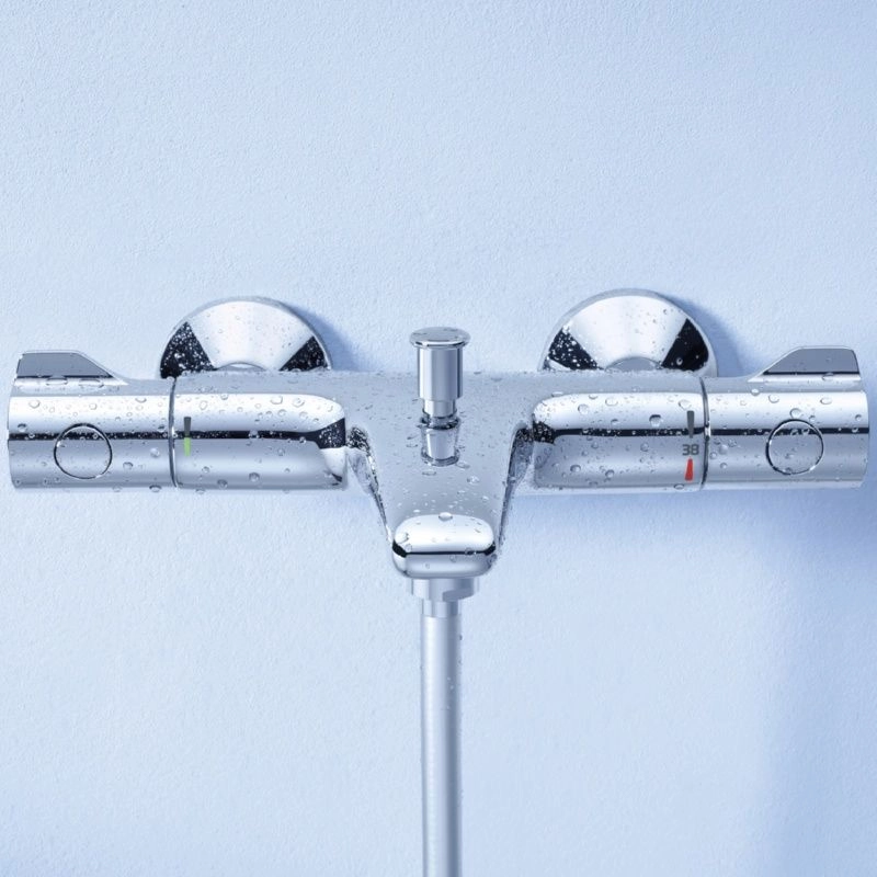 Grohe Grohtherm 800 Термостат для ванны, DN 15 настенный монтаж Grohe StarLight хромированная поверхность стопор безопасности при 38°C Grohe SafeStop Plus (дополнительная опция) дополнительный ограничитиель температры при 43° C Grohe TurboStat встроенный термоэлемент встроенный стопор смешанной воды автоматический переключатель: ванна/душ рукоятка расхода с экономичной кнопкой Grohe EcoButton и индивидуально устанавливаемым стопором керамический вентиль 1/2", 180° отвод для душа снизу 1/2" аэратор встроенные обратные клапаны грязеулавливающие фильтры с защитой от обратного потока скрытые S-образные эксцентрики металлическая розетка минимальное давление 1,0 бар Grohe EcoJoy Технология совершенного потока при уменьшенном расходе воды