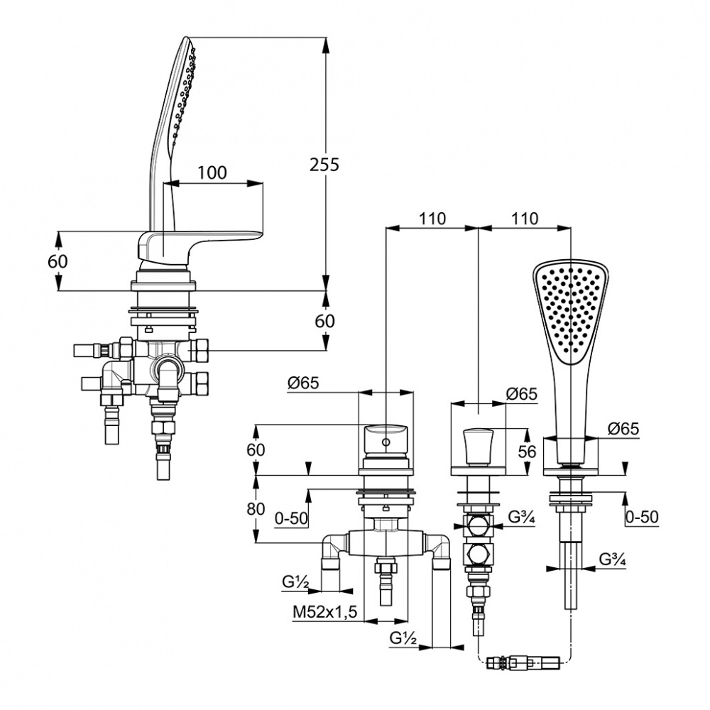 Основные характеристики: - Смеситель для ванны и душа - Способ монтажа: на борт ванны - Излив: нет - Количество монтажных отверстий: 3 - Душевая лейка - Шланг - Керамический картридж - Ограничитель температуры воды - Материал: латунь - Цвет: хром