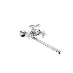 Смеситель для ванны с плоским длинным изливом с поворотным переключателем душа, керамические ручки. Хром.