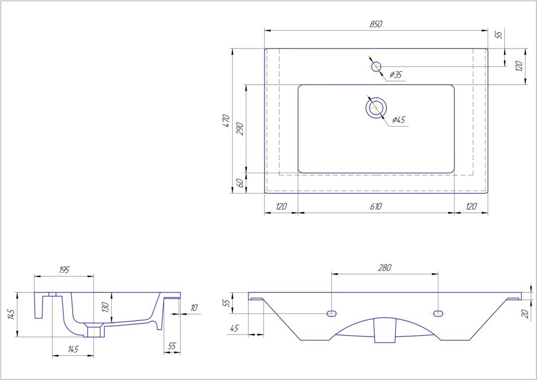 Раковина универсальная с отверстием под перелив, имеет одно отверстие под смеситель, расположение в центре