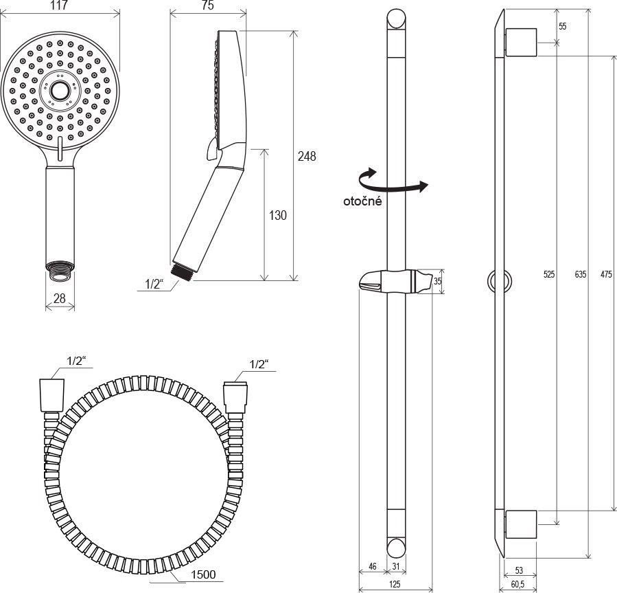- размеры: шланг из прочного пластика 150 см, лейка с 3 функциями диаметром 118 мм, подвижный душевой держатель 63 см