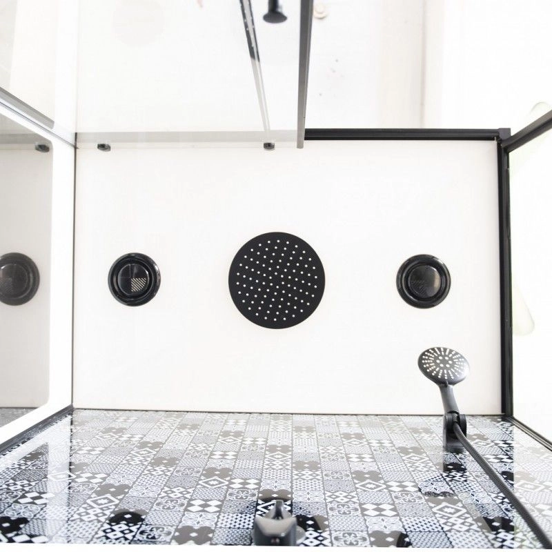 Кабина полукруглая ESBANO-ESB-100CKR -низкий (15 см) акриловый поддон черного цвета -сифон с гидрозатвором, крышка сифона в цвет поддона -задние стекла: закаленное крашеное белое стекло с интегрированным зеркалом, закаленное крашеное декорированное стекло (5мм) -передние стекла: закаленное прозрачное стекло с покрытием "easy clean" (5 мм) -профиль матовый чёрный -смеситель матовый черный -душевая многофункциональная лейка со шлангом чёрного матового цвета -держатель лейки чёрный матовый регулируемый по наклону. - крыша с верхним душем и вентиляционными отверстиями. -полочка для шампуня чёрная матовая -двойные (спаренные) верхние и нижние ролики чёрного цвета -верхний тропический душ чёрного матового цвета -зеркало, увеличенного размера, «интегрированное» в заднюю стенку кабины. РАЗМЕР: 100 х 100 х 210