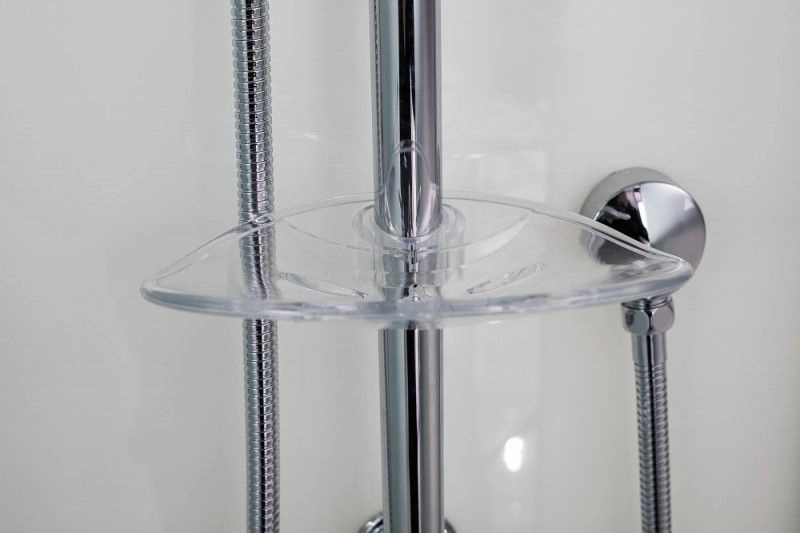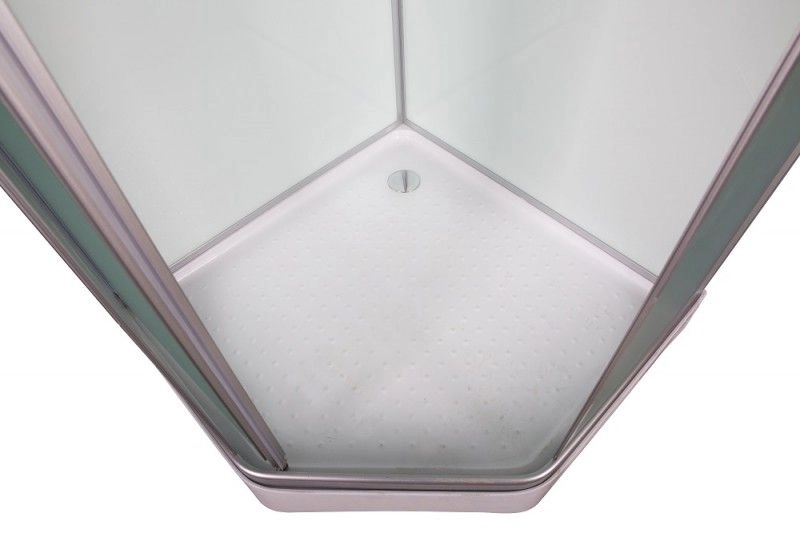 Низкий поддон. Сифон с гидрозатвором. Стекло: 5 мм, переднее - "матовое". заднее - "белое крашеное" с интегрированным зеркалом 65х30. Комплектующие: полочка со стаканчиком, смеситель, 3-х режимная душевая лейка на стойке, мыльница, двойные ролики. Модель "PR" - пятиугольная кабина со стеклянной крышей, верхним душем с прорезиненными соплами и вентиляционным отверстием.