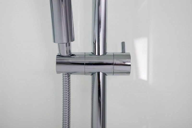 Кабина пятиугольная ESBANO-100PR (с крышей) -низкий (15 см) акриловый поддон -сифон с гидрозатвором -задние стекла: закаленное крашенное стекло (белое, 5мм) -передние стекла: закаленное рифленое стекло (5 мм) -крыша: закаленное крашенное стекло (белое, 5мм) -профиль матовый хром -смеситель -душевая многофункциональная лейка -тропический душ -вентиляционная решетка -штанга с держателем и мыльницей -большое зеркало с фацетом 38х69 -стеклянная полочка (35 см) с отверстием под стакан и ограничителем -стеклянный стакан РАЗМЕР: 100 х 100 х 210