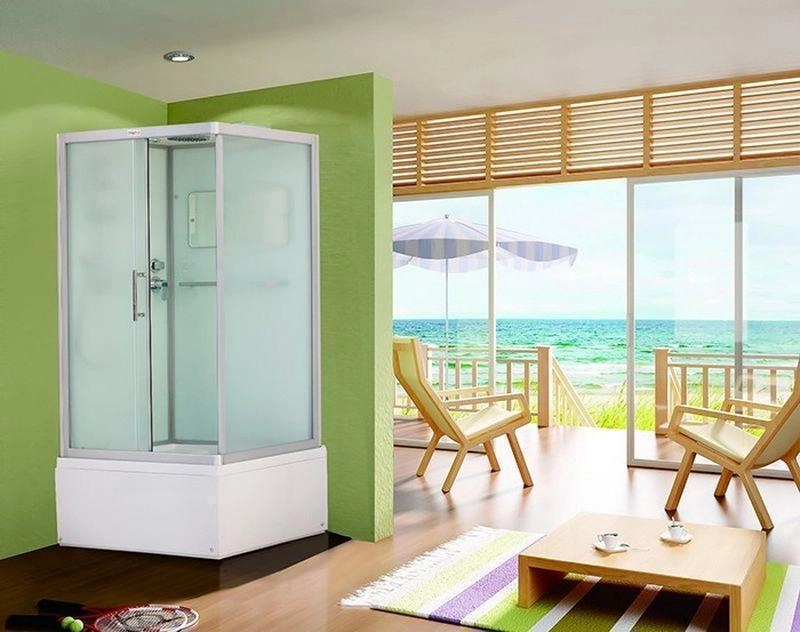 Высокий поддон. Сифон с гидрозатвором. Стекло: 5 мм, переднее - "матовое". заднее - "белое крашеное" с интегрированным зеркалом 65х30. Комплектующие: полочка со стаканчиком, смеситель, 3-х режимная душевая лейка на стойке, мыльница, двойные ролики. Модель "СКR" - квадратная/прямоугольная кабина со стеклянной крышей, верхним душем с прорезиненными соплами и вентиляционным отверстием.