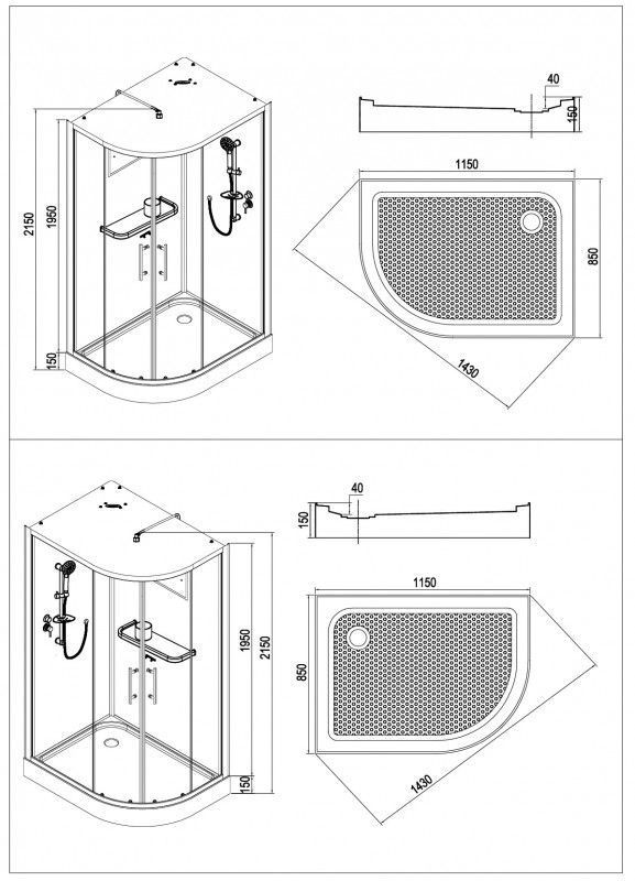 Низкий поддон. Сифон с гидрозатвором. Стекло: 5 мм, переднее - "матовое". заднее - "белое крашеное" с интегрированным зеркалом 65х30. Комплектующие: полочка со стаканчиком, смеситель, 3-х режимная душевая лейка на стойке, мыльница, двойные ролики. Модель "СR" - угловая кабина со стеклянной крышей, верхним душем с прорезиненными соплами и вентиляционным отверстием.