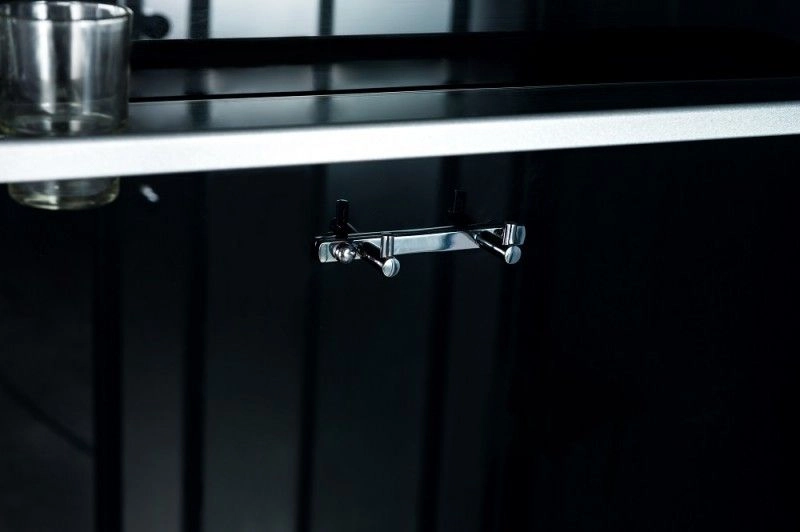 Низкий поддон. Сифон с гидрозатвором. Стекло: 5 мм, переднее - "матовое". заднее - "cерое крашеное" с интегрированным зеркалом 65х30. Комплектующие: полочка со стаканчиком, смеситель, 3-х режимная душевая лейка на стойке, мыльница, двойные ролики. Модель "СKR" - прямоугольная кабина со стеклянной крышей, верхним душем с прорезиненными соплами и вентиляционным отверстием.