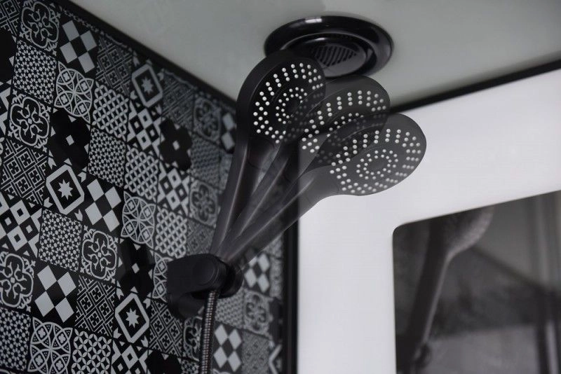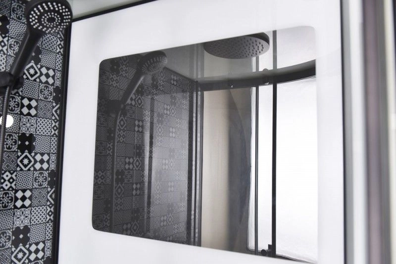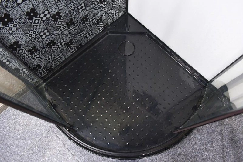 Кабина полукруглая ESBANO-ESB-80CR -низкий (15 см) акриловый поддон черного цвета -сифон с гидрозатвором, крышка сифона в цвет поддона -задние стекла: закаленное крашеное белое стекло с интегрированным зеркалом, закаленное крашеное декорированное стекло (5мм) -передние стекла: закаленное прозрачное стекло с покрытием "easy clean" (5 мм) -профиль матовый чёрный -смеситель матовый черный -душевая многофункциональная лейка со шлангом чёрного матового цвета -держатель лейки чёрный матовый регулируемый по наклону. - крыша с верхним душем и вентиляционными отверстиями. -полочка для шампуня чёрная матовая -двойные (спаренные) верхние и нижние ролики чёрного цвета -верхний тропический душ чёрного матового цвета -зеркало, увеличенного размера, «интегрированное» в заднюю стенку кабины. РАЗМЕР: 80 х 80 х 210