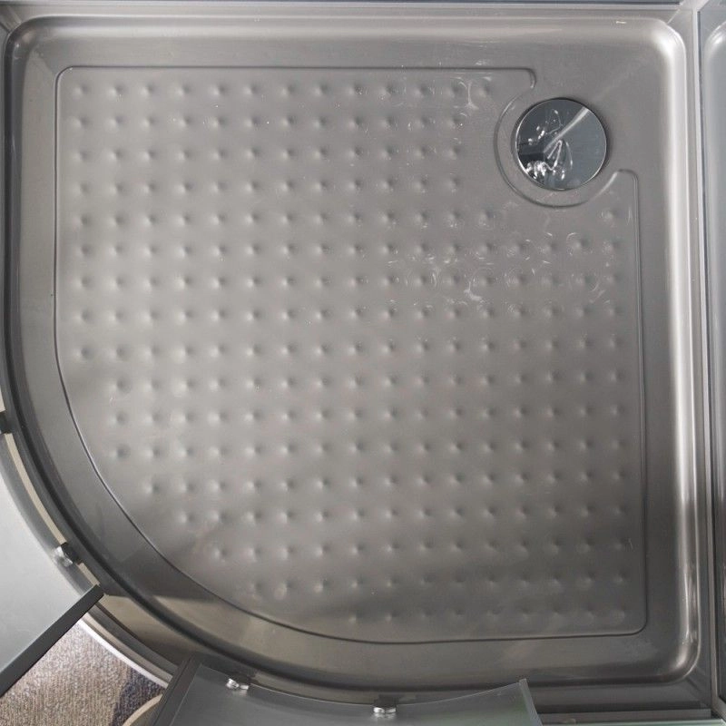 Кабина полукруглая ESBANO ESG-80CR (с крышей) -низкий (15 см) акриловый поддон серого цвета -сифон с гидрозатвором -задние стекла: закаленное крашенное стекло (серое, 5мм) -передние стекла: закаленное рифленое стекло ( 5 мм) -крыша: закаленное крашенное стекло (серое, 5мм) -профиль матовый хром -смеситель -душевая многофункциональная лейка -тропический душ -вентиляционная решетка -штанга с держателем и мыльницей -крючки для мочалки -большое зеркало с фацетом 30х69 -стеклянная полочка (32см) с отверстием под стакан и ограничителем -стеклянный стакан -двойные (спаренные) верхние и нижние ролики РАЗМЕР: 80 х 80 х 210