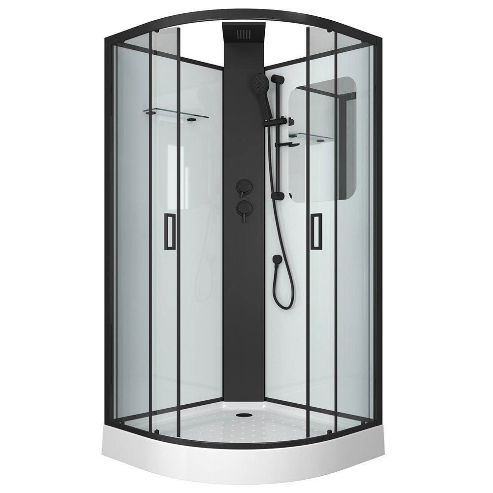 Количество коробок, 6 шт. Сборка без силикона и саморезов -да. Управление - не комплектуется пультом управления. Электропитание без электрики. Ориентация универсальная. Количество секций двери 2. Ширина входа 45 см. Толщина полотна двери, 6 мм. Цвет задней стенки белая. Исполнение задней стенки стекло закаленное стекло. Цвет корпуса черный. Цвет профиля черный. Материал профиля алюминий. Материал поддона акрил. Высота поддона, 15 см. Глубина поддона, 3см-5см. Встроенное сиденье - нет. Зеркало есть. Подголовника нет. Антискользящее покрытие есть. Вентиляции нет. Освещения нет. Полочка есть. Регулируемая высота ножек - 0,5-1,5см. Тропический (верхний) душ - есть. Турецкая баня - нет. Комментарии -слив в углу.