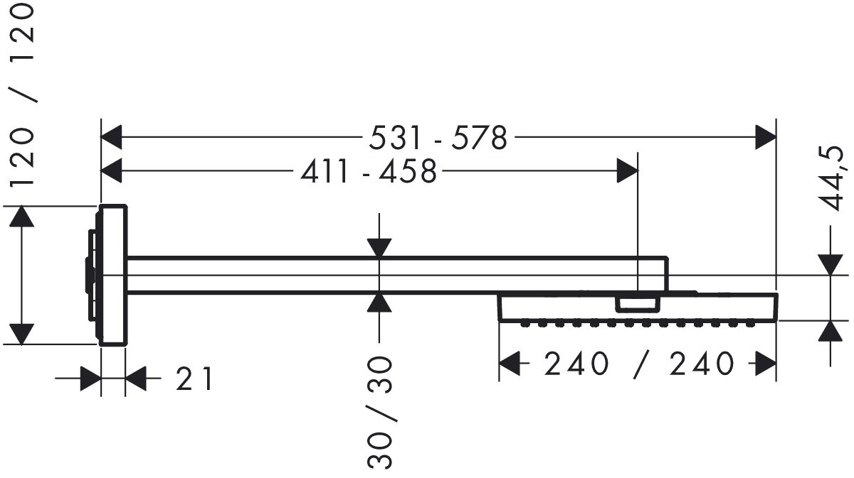 размер душевого диска: 240 x 240 мм длина держателя для душа: металлический держатель для душа 411 – 458 мм тип струи: RainAir расход воды для струи RainAir (при 3 бар): 12 л/мин расход воды с возможностью увеличения на 25 л/мин полностью хромированный душевой диск материал душевого диска: металл съемный душевой диск для очистки монтаж: стена соединительная резьба G ½ не подходит для проточных водонагревателей
