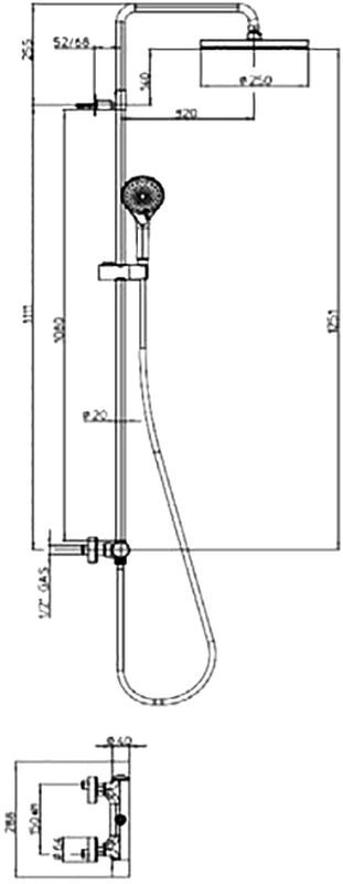 механический однорычажный смеситель изготовлен из латуни и оснащен внутренним переключателем на два выхода (верхний душ и ручная лейка), пропускная способность смесителя - 25 л/мин при давлении 3 бар
