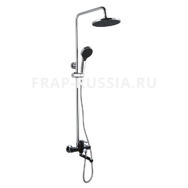 Форма душа круглая. Размер верхнего душа 22 (см). Поворотный излив. Состав поставки : штанга, тропическая лейка, ручная лейка, смеситель с регулировками крепежи для настенного монтажа