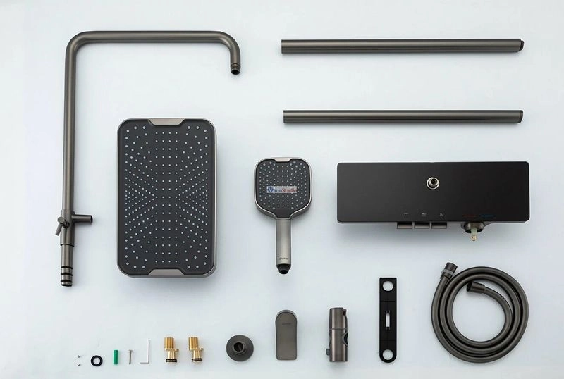 Комплектация стойки включает кронштейн для верхнего душа, набор эксцентриков, переключатель потоков, душевую штангу, держатель лейки, верхний душ, шланг, смеситель, ручной душ и монтажный комплект.