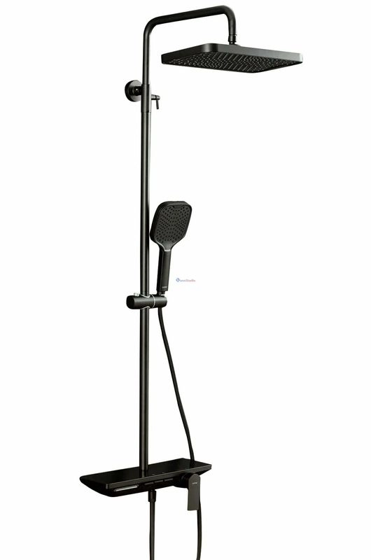 Стойка имеет настенный и потолочный монтаж, что позволяет выбрать наиболее удобное место для установки. В комплекте с душевой стойкой идут три режима лейки ручного душа и один режим верхнего душа.