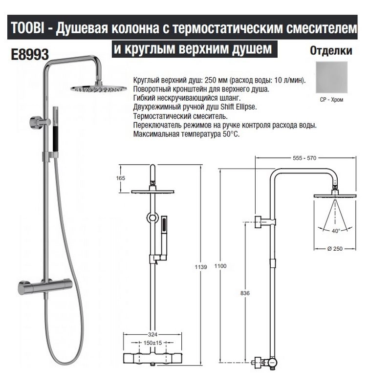 Двухрежимный ручной душ Shift Ellipse . Поворотный кронштейн для верхнего душа .