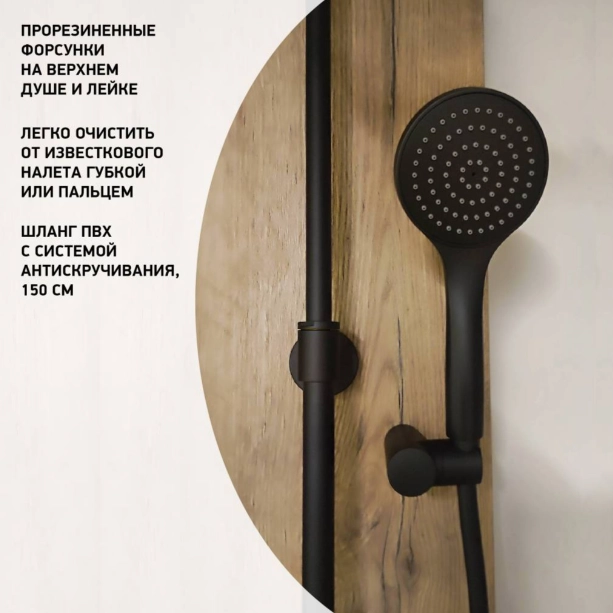 Прорезиненные форсунки на верхнем душе и лейке легко очищаются от известкового налета губкой или пальцем.