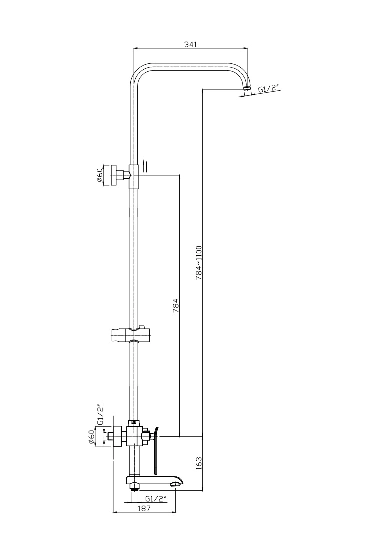 • Длина колена душ.штанги для троп-ой лейки - 341мм.