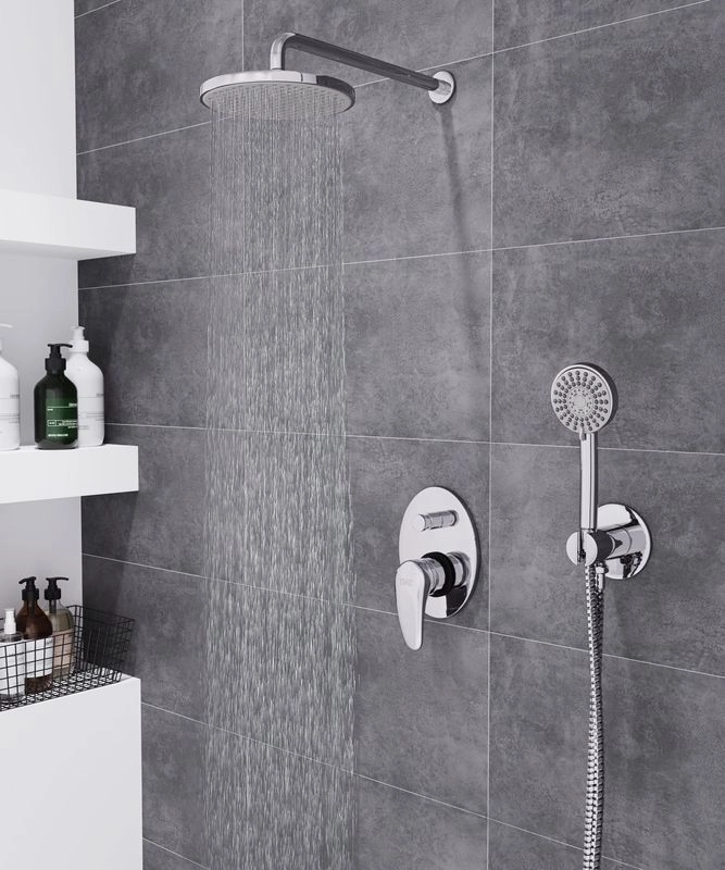 Готовое решение! В набор входит: Смеситель скрытого монтажа с переключателем: корпус - латунь кат. A, картридж универсальный ESKO- 35мм,переключатель помповый с фиксатором, ушки для монтажа, отражатель с прокладками и монтажный комплект Лейка верхнего душа: диаметр 226мм, на подвижном шарнире, материал - ABS пластик/хром,Форсунки Self-Clean Device, Eco system Держатель верхнего душа с отводом: длина 376мм, нерж.сталь/хром,кронштейн крепления и декоративный отражатель Ручная лейка: диаметр 100мм, 5 режимов, Форсунки Self-Clean Device, Eco system Держатель ручного душа с отводом: вертикальный, матриал - латунь,хром Душевой шланг 1,6м: армированный ПВХ - серебристый, FreeRotation