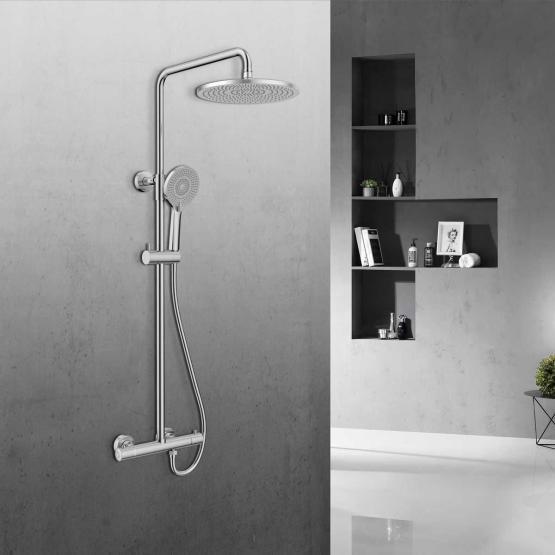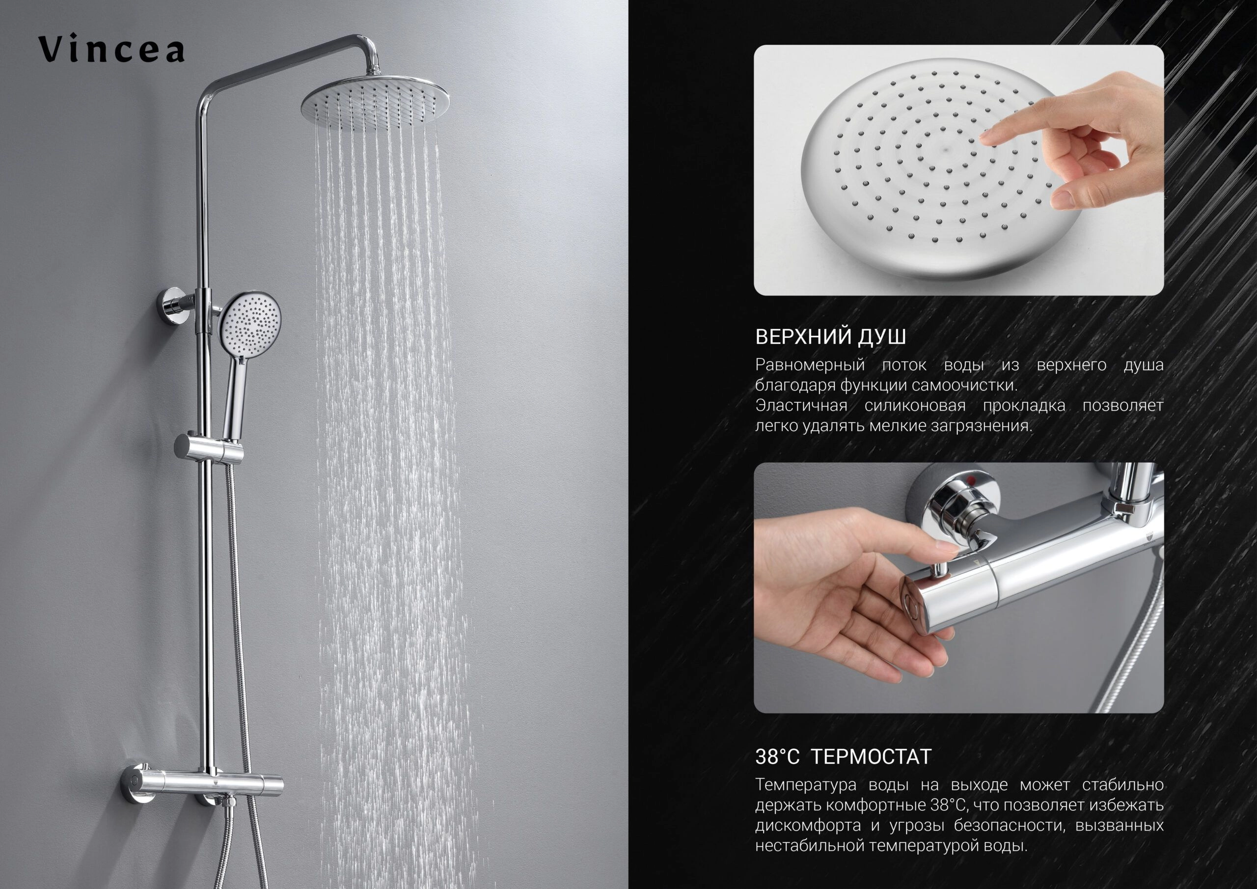Ограничитель температуры<br>Поверхность глянцевая<br>Стандарт подводки 1/2"<br>Механизм термостат<br>Длина шланга, см* 150<br>Состав комплекта :Верхний душ, ручной душ, смеситель со встраиваемой частью<br>