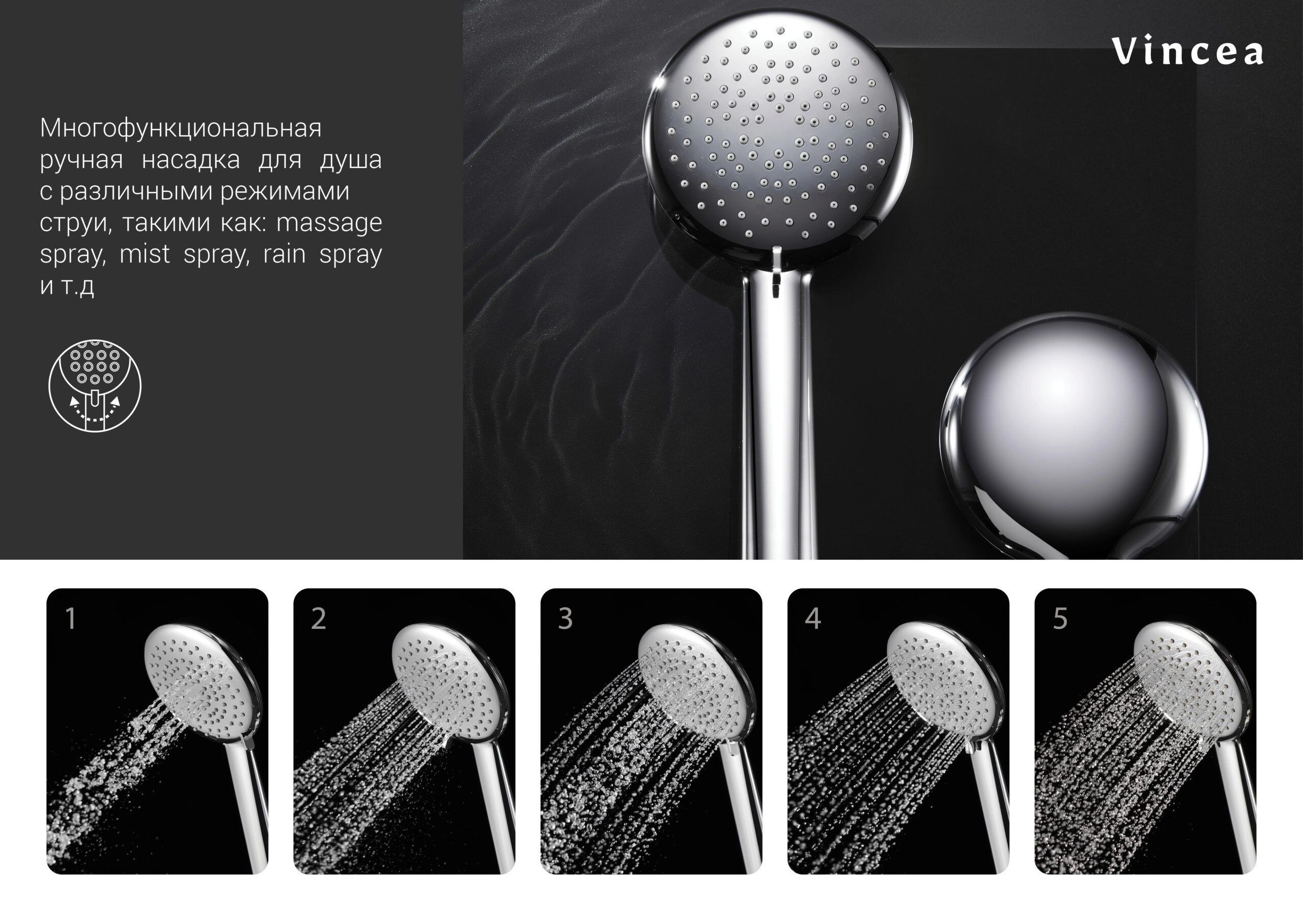 Пятифункциональный ручной душ<br>Материал латунь<br>Форма верхнего душа круглая<br>Размер верхнего душа, мм