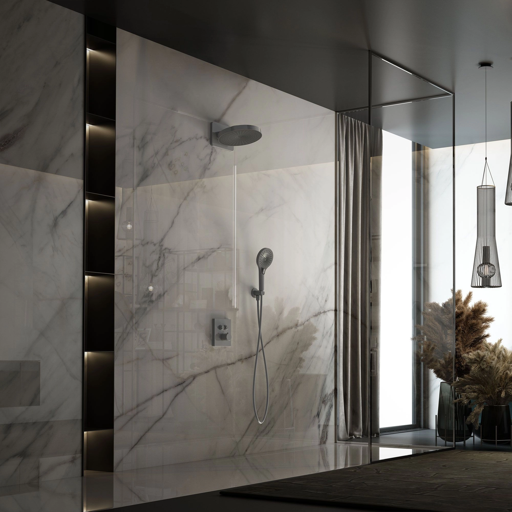 Состав комплекта : Верхний душ, полка с изливом и держателем ручного душа, ручной душ, смеситель со встраиваемой частью