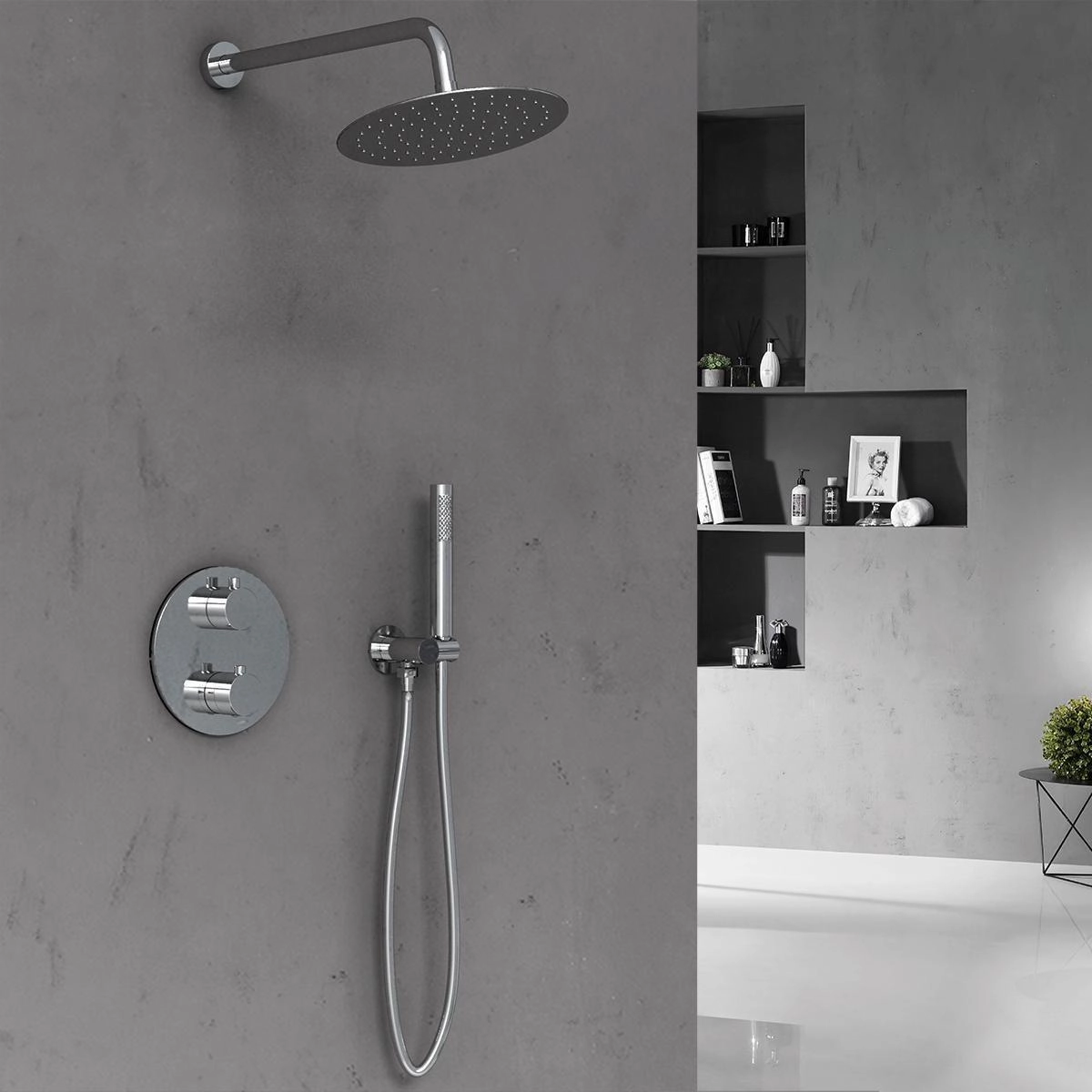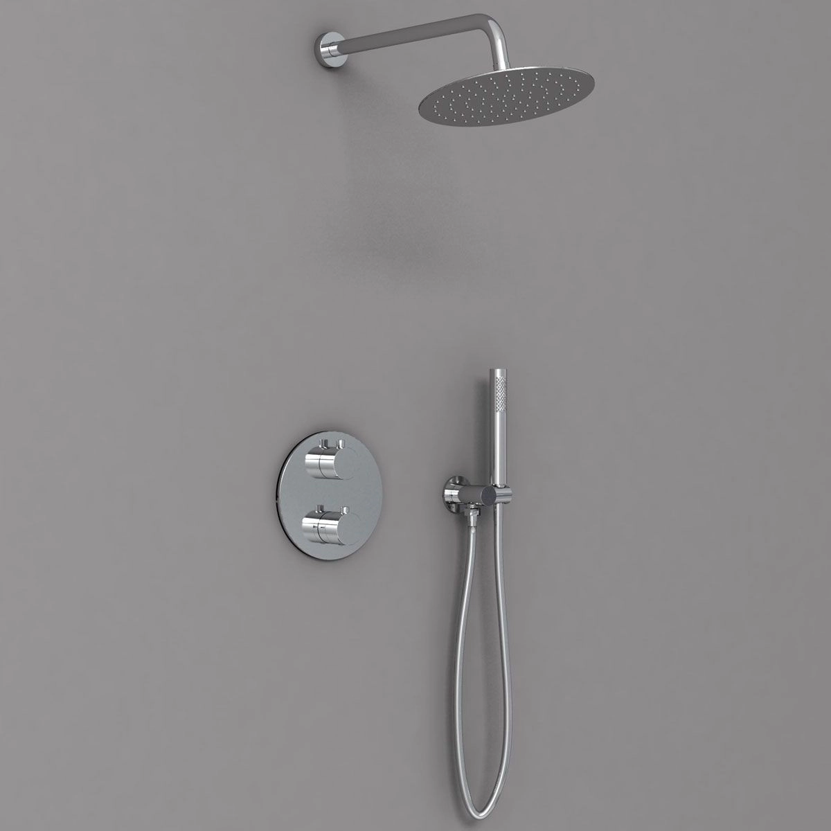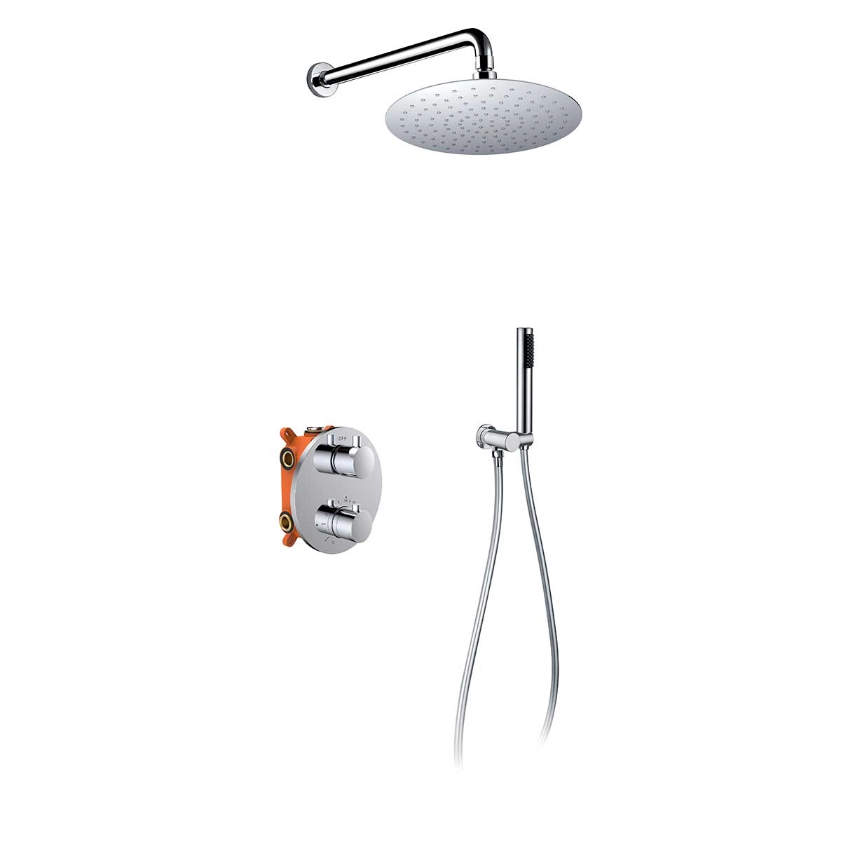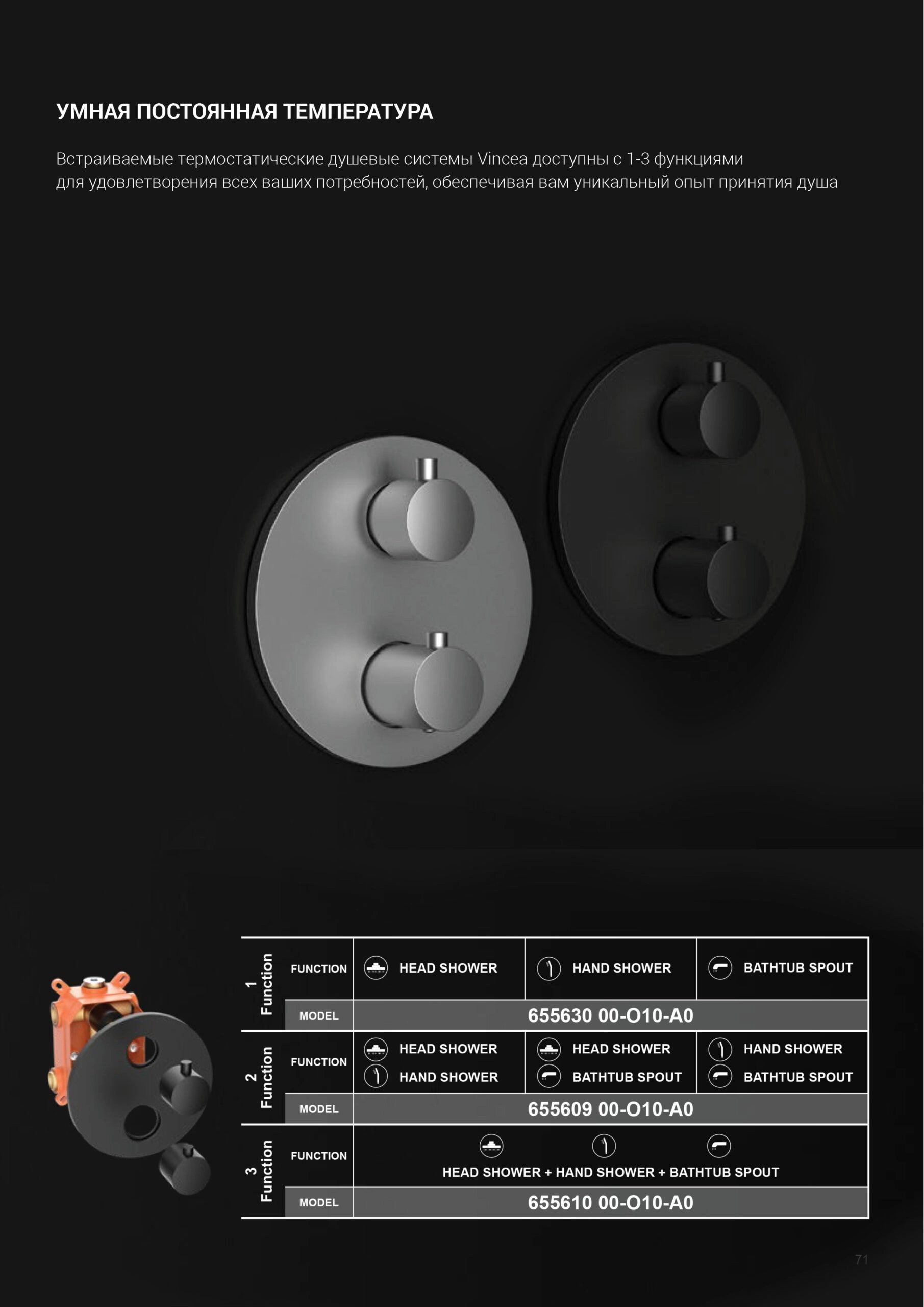 Комплектуется термостатическим картриджем Vernet<br>Материал латунь<br>Форма верхнего душа круглая<br>Размер верхнего душа, мм 255x255<br>Материл ручного душа латунь<br>Материал верхнего душа нержавеющая сталь<br>Легкое очищение,