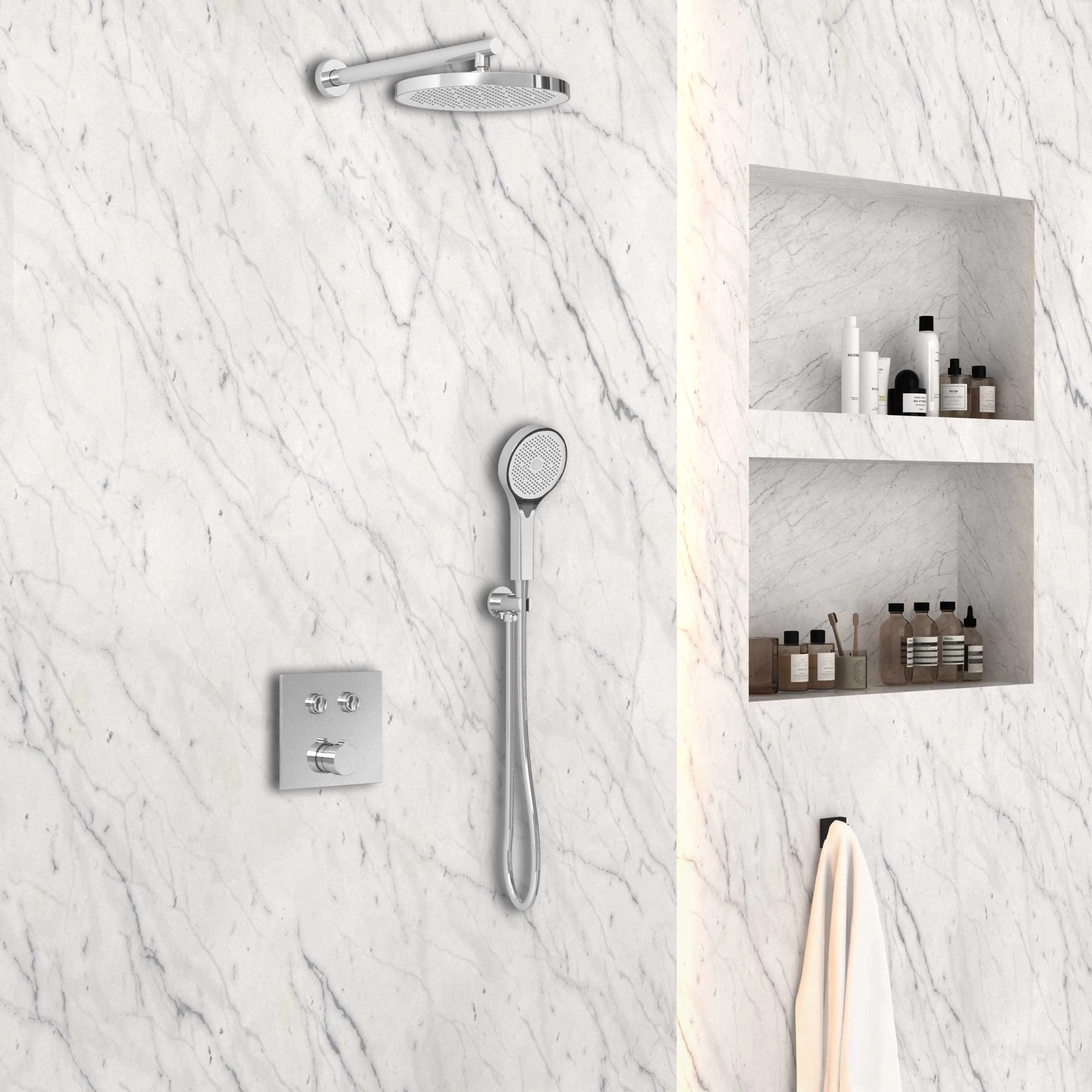 Состав комплекта : Верхний душ, держатель ручного душа, ручной душ, встраиваемый смеситель