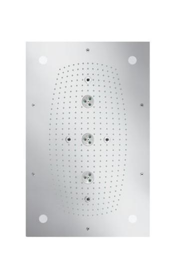 размер душевого диска: 680 x 460 мм тип струи: RainAir, WhirlAir, RainAir XXL расход воды для струи RainAir (при 3 бар): 20 л/мин расход воды при режиме RainAir XXL (при давлении 3 бар): 24 л/мин расход воды для струи WhirlAir (при 3 бар): 22 л/мин Управление тремя зонами струй осуществляется посредством трех вентилей или одного переключающего вентиля с тремя отверстияетвлениями полностью хромированный душевой диск материал душевого диска: металл соединительная резьба G ¾ со встроенным освещением источник питания: 230 В / 50 Гц лампочка: 4 x 20 Вт низковольтные галогенные рефлекторные лампы, включая блок питания 80 ВА