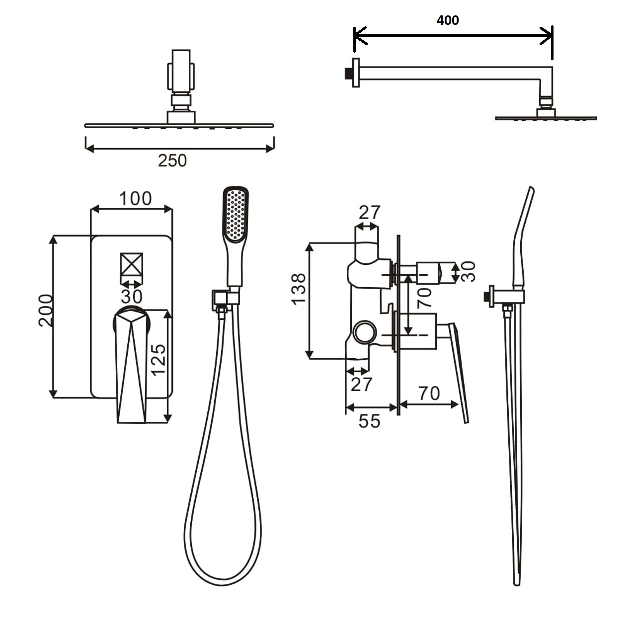 Смеситель встроенный верхний душ ручной душ